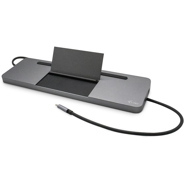Ergonomiczna metalowa stacja dokująca USB-C z obsługą do 3 zewnętrznych monitorów. Stacja jest kompatybilna z każdym laptopem wyposażonym w port USB-C lub Thunderbolt 3 (zintegrowany kabel o długości 60 cm jest wystarczająco długi, aby połączyć wszystkie laptopy z ekranami o rozmiarze do 15 ). Stacja dokująca zapewnia 4x porty USB, niezawodne i szybkie połączenie z sieciami firmowymi dzięki zintegrowanemu portowi LAN i mocy do 85 W. Konstrukcja stacji pozwala również na wykorzystanie jej jako podstawy do laptopa.