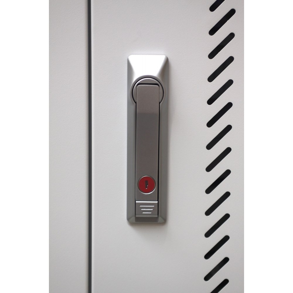 Stacja Ładowania TechlyPro I-CABINET-30DTY została zaprojektowana oraz wykonana jako uniwersalne oraz mobilne narzędzie do jednoczesnego ładowania i przechowywania wielu urządzeń mobilnych, jak notebooki, tablety czy smartfony. Niezwykle solidna i innowacyjna konstrukcja oraz system zamykanych na klucz drzwi gwarantują bezpieczeństwo i ochronę elektroniki użytkowej przed kradzieżą, zniszczeniem lub nieautoryzowanym dostępem. Stacja Ładowania Techly I-CABINET-30DTY jest idealnym rozwiązaniem dla biur, pracowni komputerowych, sal lekcyjnych oraz każdego innego miejsca, w którym wiele urządzeń mobilnych musi zostać bezpiecznie przechowana i naładowana do użytku następnego dnia. Perforowane drzwi zarówno frontowe jak i tylne gwarantują odpowiedni przepływ powietrza i chronią elektronikę przed przegrzaniem w trakcie ładowania. Dodatkowo jedna ze ścian bocznych wyposażona została w trzy wentylatory 120x120mm każdy, które zapewniają poprawę cyrkulacji powietrza oraz odprowadzają nadmiar ciepła z wnętrza stacji. W calu zapewnienia maksymalnej wygody i mobilności Stacja Ładowania Techly I-CABINET-30DTY wyposażona została w cztery solidne jezdno-skrętne kółka oraz dwa uchwyty boczne umożliwiające wygodne przemieszczanie urządzenia, dwa kółka posiadają hamulec dzięki któremu stację można bezpiecznie zablokować w preferowanym miejscu. Mobilna stacja do bezpiecznego przechowywania oraz ładowania do 30 urządzeń mobilnych takich jak notebooki, tablety czy smartfony Trzy półki wyposażone w plastikowe przegrody z organizerami przewodów, każda z półek z miejscem na 10 urządzeń Plastikowe przegrody z opcją demontażu umożliwiają własną aranżację przestrzeni oraz możliwość pomieszczenia szerszych urządzeń Dwuskrzydłowe wentylowane drzwi frontowe z dwupunktowym zamkiem oraz możliwością otwarcia pod katem 180° Dwuskrzydłowe wentylowane drzwi tylne z dwupunktowym zamkiem oraz możliwością otwarcia pod katem 180° Tylna część wyposażona w sześć 5-cio gniazdowych listew zasilających standardu Schuko, w sumie 30 gniazd zasilania AC Każda z listew zasilających z indywidualnym wyłącznikiem zasilania Organizery oraz przepusty kablowe umożliwiają swobodne oraz schludne przeprowadzenie przewodów zasilających od listew do ładowanych urządzeń Wyposażona w zewnętrzny główny wyłącznik zasilania z podświetlaniem oraz wewnętrzny wyłącznik nadprądowy 1P C 16A 4.5kA Dodatkowe zewnętrzne gniazdko Schuko o klasie szczelności IP44 umożliwia podłączenie innych urządzeń elektrycznych Uniwersalne gniazdo zasilania stacji ze złączem C20, w zestawie kabel zasilający o długości 2.2m Wyposażona w cztery 5 kółka najwyższej jakości (dwa kółka z funkcją blokady) oraz dwa uchwyty boczne zapewniające swobodne przemieszczanie stacji W pełni zmontowana, zbudowana z solidnej metalowej ramy oraz blach o grubości 1.5mm, całość malowana proszkowo