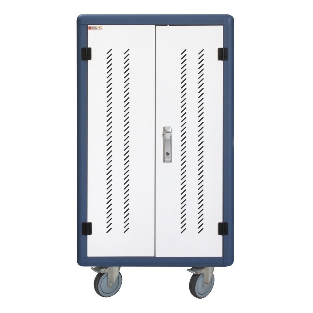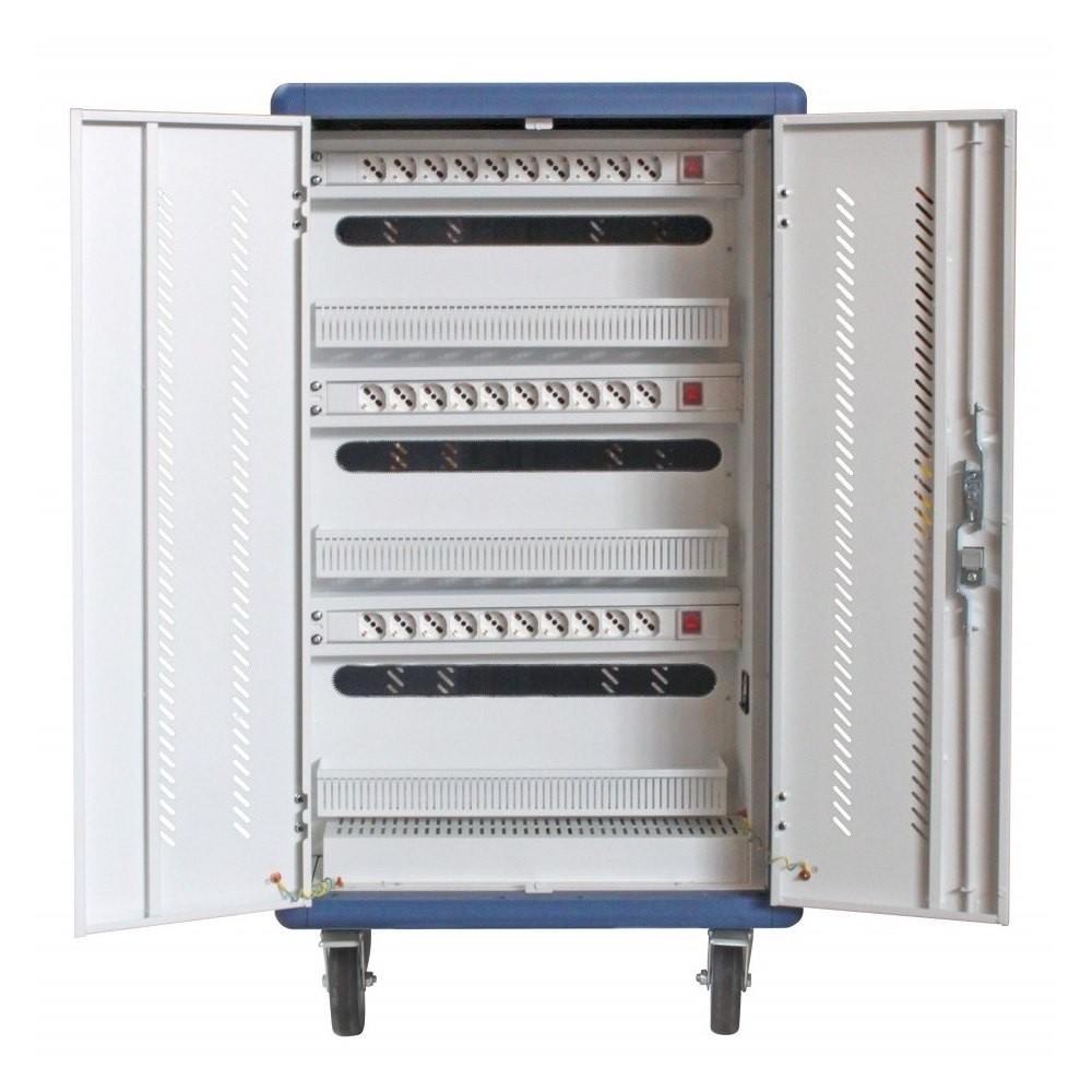 Szafa Ładująca Techly I-CABINET-30DUTY, P/N: 108880 Mobilna 30-Portowa Stacja Ładowania Telefonów, Tabletów, Laptopów, 30 Portów USB-A 5V 2.1A, 30 Gniazd AC Profesjonalny, mobilny wózek to bezpiecznego przechowywania, transportowania oraz ładowania urządzeń mobilnych Przystosowana do jednoczesnej obsługi do 30 urządzeń typu telefony, tablety czy laptopy Wyposażona w 30 portów USB (5V / 2.1A) we frontowej części szafy - po 10 portów USB na każdej z trzech półek Wyposażona w 30 gniazd AC w tylnej części szafy - 3 listy PDU po 10 gniazd AC każda Każda z trzech listew PDU wyposażona w indywidualny włącznik zasilania Trzy półki wyposażone w plastikowe przegrody z organizerami przewodów, każda z półek z miejscem na 10 urządzeń Dwuskrzydłowe wentylowane drzwi frontowe z dwupunktowym zamkiem oraz możliwością otwarcia pod katem 180° Dwuskrzydłowe wentylowane drzwi tylne z dwupunktowym zamkiem oraz możliwością otwarcia pod katem 180° Organizery oraz przepusty kablowe umożliwiają swobodne oraz schludne przeprowadzenie przewodów zasilających od listew do ładowanych urządzeń Stałopozycyjne panele boczne z perforacjami wentylacyjnymi oraz trzema wentylatorami 120x120 mm na prawym panelu bocznym Wyposażona w zewnętrzny główny wyłącznik zasilania z podświetlaniem oraz wewnętrzny wyłącznik nadprądowy 1P C 16A Dodatkowe zewnętrzne gniazdko Schuko o klasie szczelności IP44 umożliwia podłączenie innych urządzeń elektrycznych Dodatkowy, zewnętrzny port USB-A zapewnia szybkie podłączenie i ładowanie kolejnego urządzenia mobilnego Uniwersalne gniazdo zasilania stacji ze złączem C20, w zestawie kabel zasilający o długości 2.2m Wyposażona w cztery 5 kółka najwyższej jakości (dwa kółka z funkcją blokady) oraz dwa uchwyty boczne zapewniające swobodne przemieszczanie stacji W pełni zmontowana, zbudowana z solidnej metalowej ramy oraz blach o grubości 1.5mm, całość malowana proszkowo Wyposażona w zestaw uziemiający Całość wykonana z najwyższej jakości materiałów z dbałością o szczegóły i detale