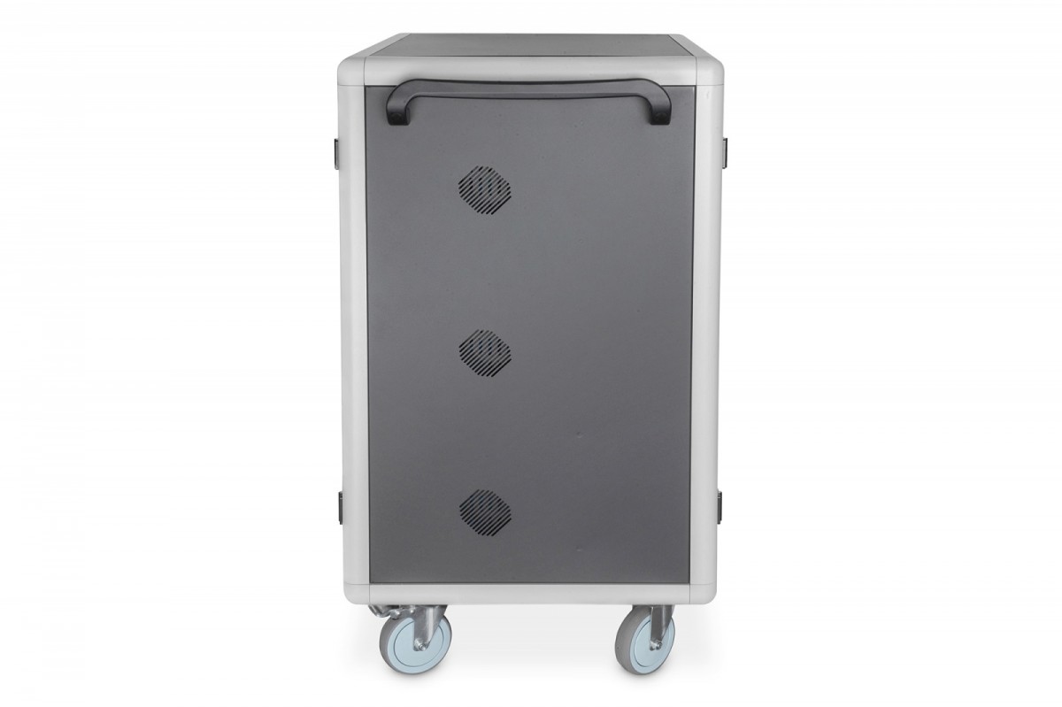 Mobilna szafa ładująca DIGITUS jest idealnym i kompaktowym rozwiązaniem do przechowywania i ładowania urządzeń przenośnych, takich jak notebooki i tablety. Mobilne szafy ładujące są często wykorzystywane w obiektach użyteczności publicznej, takich jak szkoły, do bezpiecznego przechowywania urządzeń w centralnym miejscu, gdzie mogą być one ładowane w tym samym czasie. Szafa zawiera 3 rzędy po 10 ładowarek, każda z własnym portem USB z przodu. Dodatkowo urządzenia mogą być podłączone z tyłu za pomocą wbudowanych listew gniazdowych (3 x 10-krotny styk ochronny). Dzięki dużym prowadnicom kablowym i półkom o dużej długości zapewnione jest optymalne zarządzanie kablami. Wbudowane wentylatory (3 x 24 V) w połączeniu ze szczelinami wentylacyjnymi zapewniają aktywne chłodzenie szafy. Dwuskrzydłowe drzwi przednie i tylne System blokady push lock z obrotową dźwignią na przednich i tylnych drzwiach, zamykany na klucz Kąt otwarcia drzwi 180 2-punktowa blokada (blokada drążka) 30 miejsc (3 x 10) dla urządzeń 30 x złącza USB-C 18W (5V/3A, 9V/2A, 12V/1.5A) 3 x tylna listwa gniazdowa (10 x gniazdo ze stykiem ochronnym) Prowadnica kablowa i miejsce na nadmiar kabli na każdym poziomie Kompaktowa obudowa, mobilna dzięki zamontowanym rolkom 3 x wentylatory (24 V) do aktywnego chłodzenia szafy Z wyłącznikiem różnicowoprądowym 30 mA W zestawie 4 kółka (2 z blokadą) W razie potrzeby kółka można zdemontować Zawiera uchwyty dla lepszej mobilności (w zestawie) Podłączenie styku uziemienia (AC) z przełącznikiem z boku C20 Złącze z boku Zawiera miniaturowy wyłącznik automatyczny 30 mA Dostarczany w pełni zmontowany Głębokość wewnętrznej półki: 415 mm (odpowiednia dla urządzeń do 15,6") Moc wyjściowa portu USB-C: 18 W (5 V 3 A) na port; 540 W maks. Kontrola temperatury: wentylatory uruchamiają się automatycznie, gdy temperatura wewnętrzna przekroczy 40 °C W razie potrzeby można usunąć niebieskie plastikowe wsporniki