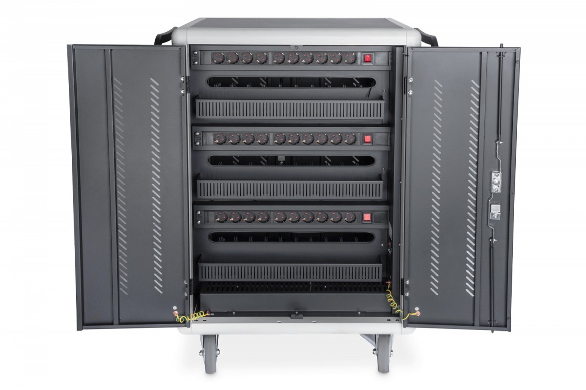 Mobilna szafa do ładowania firmy DIGITUS jest idealnym i kompaktowym rozwiązaniem do przechowywania i ładowania urządzeń przenośnych, takich jak notebooki i tablety. Mobilne szafy do ładowania są często wykorzystywane w obiektach użyteczności publicznej, takich jak szkoły, do bezpiecznego przechowywania urządzeń w jednym miejscu, a ponadto ich jednoczesnego ładowania. Szafa zawiera 3 rzędy po 10 ładowarek, z czego każda dysponuje własnym portem USB z przodu. Dodatkowo urządzenia mogą być podłączone z tyłu za pomocą wbudowanych listew gniazdowych (3 x 10-drożne ze stykiem ochronnym). Dzięki dużym prowadnicom kablowym i półkom o dużej długości zapewnione jest optymalne zarządzanie kablami. Wbudowane wentylatory (3 x 24 V) w połączeniu ze szczelinami wentylacyjnymi zapewniają aktywne chłodzenie szafy. Zintegrowane lampy UV-C zapewniają sterylne warunki, a tym samym ekologiczność i lepszą higienę. Urządzenie można podłączyć do zewnętrznego portu USB, aby wykonać scentralizowaną synchronizację danych. 30 miejsc (3 x 10) dla urządzeń 30 x złącza USB A Wydajność wyjściowa portu USB A: 10 W (5 V 2,1 A) na port; maks. 300 W 3 x tylna listwa gniazdowa (10 x gniazdo ze stykiem ochronnym, w komplecie z wyłącznikiem) Prowadnica kablowa i miejsce na nadmiar kabli na każdym poziomie Kompaktowa obudowa, mobilna dzięki zamontowanym kółkom 3 x wentylatory (24 V) do aktywnego chłodzenia szafy Wentylatory uruchamiają się automatycznie, gdy temperatura wewnątrz przekroczy 40°C Z wyłącznikiem różnicowoprądowym 30 mA Dwuskrzydłowe drzwi przednie i tylne System blokady ciśnieniowej z klamką na przednich i tylnych drzwiach, zamykany na klucz Kąt otwarcia drzwi 180° 2-punktowe ryglowanie (blokada prętowa) 4 kółka jezdne (2 z hamulcem) Uchwyty do łatwego przemieszczania (w zestawie) Przyłącze styku ochronnego (AC) z przełącznikiem z boku Złącze C20 z boku szafki Produkt dostarczany w stanie zmontowanym Głębokość wewnętrznej półki: 415 mm (nadaje się na urządzenia do 15,6'') W razie potrzeby kółka można zdemontować