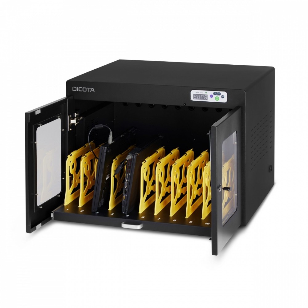 Szafka ładująca sprawia, że urządzenia są zawsze gotowe i naładowane. Bezpieczna, energooszczędna technologia przechowywania - do stosowania w różnorodnych środowiskach pracy i szkole. Za pomocą szafki możesz ładować jednocześnie 10 notebooków, ultrabooków lub tabletów, dzięki czemu nie musisz martwić się o brak wystarczającej liczby gniazdek.