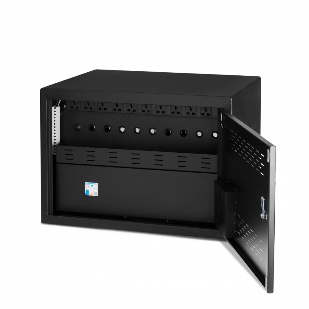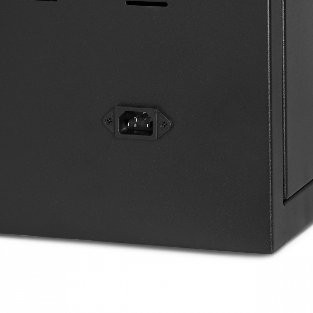 Wysuwane i ponumerowane przegródki ułatwiają przyporządkowanie urządzeń poszczególnym użytkownikom. Lampa UV-C dezynfekuje urządzenia w sposób przyjazny dla środowiska i wolny od środków chemicznych. Dezynfekcja trwa pięć minut po aktywacji, a następnie wyłącza się automatycznie. Za pomocą panelu sterującego można sterować światłem UV i czasem ładowania - od jednej do 24 godzin. Po upływie wybranego czasu proces ładowania kończy się automatycznie. Aby chronić urządzenia przed przegrzaniem, szafa ładująca została wyposażona w mocny i cichy wentylator. Maksymalna ochrona dzięki solidnej stalowej obudowie i widocznym podwójnym drzwiom z wbudowanym zamkiem na klucz. Można zestawić maksymalnie dwie szafy, aby zwiększyć pojemność aż do 20 urządzeń. Szafka ładująca jest dostarczana z wtyczką zasilania dostosowaną do danego kraju i listwą przyłączeniową do laptopów i tabletów. Bezpiecznie ładuj i przechowuj do 10 notebooków, ultrabooków lub tabletów o przekątnej do 14 cali Nadaje się do placówek oświatowych i opieki zdrowotnej, przemysłu, miejsc spotkań, hoteli i cateringu Numerowana, wysuwana szuflada ułatwia dostęp do urządzeń Solidna stalowa obudowa zapewniająca maksymalną ochronę 2 szafy można ustawić jedna na drugiej, aby zwiększyć pojemność aż do 20 urządzeń Drzwi dwuskrzydłowe, mechanizm 2-punktowy z wbudowanym zamkiem kluczowym (w zestawie 2 klucze) Zamykany panel tylny (1 klucz w zestawie) Wbudowany wentylator i otwory wentylacyjne zapobiegają przegrzaniu podczas ładowania Inteligentny, cyfrowy panel sterowania do ustawiania timera i światła UV Okres ładowania można ustawić w zakresie od jednej do 24 godzin Lampa UV-C dezynfekuje urządzenia w sposób przyjazny dla środowiska i wolny od środków chemicznych Łatwe i dostępne zarządzanie kablami Szafka ładująca jest wyposażona w specyficzną dla danego kraju wtyczkę zasilania i listwę przyłączeniową do laptopów i tabletów Przełącznik ochrony przeciwprzepięciowej