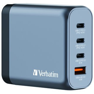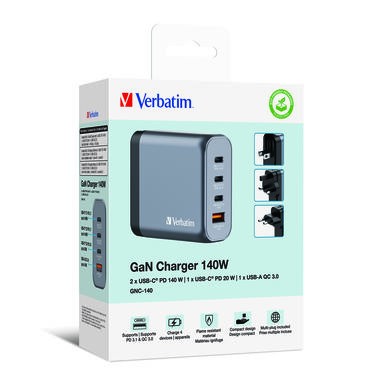 Ładowarka ścienna Verbatim GNC-140 GaN 32203 to wielofunkcyjne urządzenie o mocy 140 W, które oferuje cztery porty: dwa porty USB-C PD 140 W, jeden port USB-C PD 20 W oraz jeden port USB-A QC 3.0, zamknięte w kompaktowej i eleganckiej obudowie. Doskonale sprawdzi się zarówno w biurze, jak i w domu, a także podczas podróży, umożliwiając jednoczesne zasilanie laptopów, tabletów, smartfonów, urządzeń gamingowych i wielu innych urządzeń.