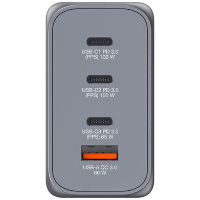 Moc wyjściowa w pojedynczym porcie: Moc wyjściowa USB-C1 PD 3.0: 3,3-21 V5 A, 5 V3 A, 9 V3 A, 12 V3 A, 15 V3 A, 20 V5 A (maks. 100 W) Moc wyjściowa USB-C2 PD 3.0: 3,3-21 V5 A, 5 V3 A, 9 V3 A, 12 V3 A, 15 V3 A, 20 V5 A (maks. 100 W) Moc wyjściowa USB-C3 PD 3.0: 3,3-11 V5 A, 5 V3 A, 9 V3 A, 12 V3 A, 15 V3 A, 20 V3,25 A (maks. 65 W) Moc wyjściowa USB-A QC 3.0: 4,5 V 5 A, 5 V 4,5 A, 5 V 3 A, 9 V 3 A, 12 V 3A, 20 V 3 A (maks. 60 W)