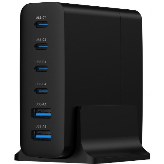 Szybka ładowarka GaN 6xUSB, 75W, czarna Łączna moc ładowania 75 W dla smartfonów lub tabletów Port typu C lub standardowy port USB do szybkiego ładowania większości smartfonów Szybka ładowarka USB 6-portowa 75 W: obsługuje zarówno specyfikację QC 3.0, jak i PowerDelivery (PD) Technologia GaN: kompaktowa konstrukcja i zwiększona efektywność energetyczna Porty typu C obsługują 25 W PD, porty typu A obsługują 18 W QC 3.0 Inteligentne zabezpieczenie przed przetężeniem, przepięciem, zwarciem i przegrzaniem Zawiera praktyczną podstawkę biurkową i przewód zasilający Funkcja szybkiego ładowania jest dostępna tylko w przypadku urządzeń obsługujących szybkie ładowanie