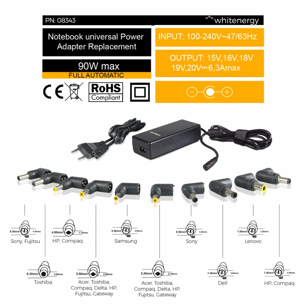 Końcówki: [6.3*3.0mm Toshiba] [6.5*4.4mm (1.4mm pin) Sony, Fujitsu] [4.8*1.7mm Compaq, HP] [5.5*2.5mm Acer, Compaq, Delta, HP, Fujitsu, Gateway, Toshiba, Liteon] [5.0*3.0mm (1.0mm pin) Samsung] [5.5*2.1mm Acer, Comapaq, Delta, HP, Fujitsu, Gateway, Toshiba, Liteon] [6.5*4.4mm (1.4mm) Sony] [7.4*5.0mm Dell] [7.9*5.4mm IBM, Lenovo] [7.4*5.0mm HP, Compaq]