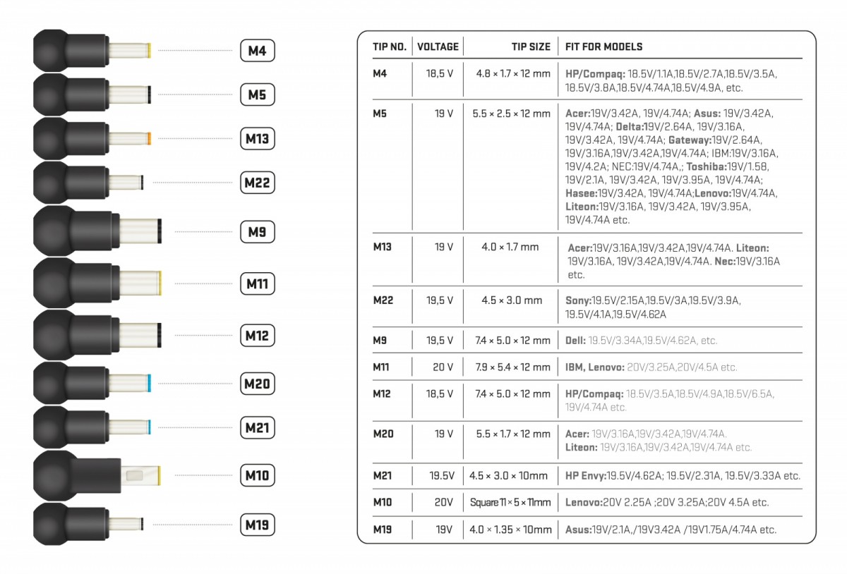 Uniwersalny zasilacz do laptopa kompatybilny z większością modeli dostępnych na rynku dzięki zestawowi 11 odłączanych wtyczek. W celu zapewnienia maksymalnej ochrony Twojego urządzenia zasilacz wyposażono w zabezpieczenie przed nadmiernym natężeniem prądu, przepięciem i zwarciem. Kabel sieciowy znajduje się w zestawie. Wejście: AC 100~240 V (50~60 Hz), 2 A Wyjście: DC 18,5 V / 19 V / 19,5 V / 20 V (maks. 90 W) 11 odłączanych wtyczek Ochrona przed przeciążeniem i zwarciem