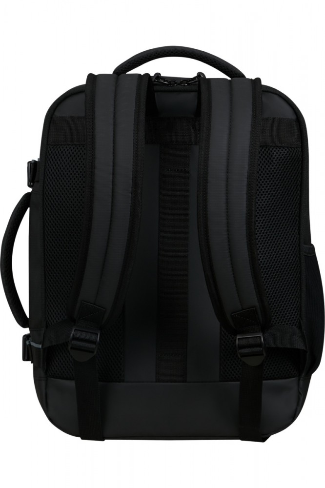 Plecak posiada miękkie, regulowane pasy ramienne, wyściełany panel tylny i miękki uchwyt do przenoszenia. Wykończony pasami kompresyjnymi do regulacji objętości na jednym z boków i pasem do mocowania na walizce lub torbie podróżnej.