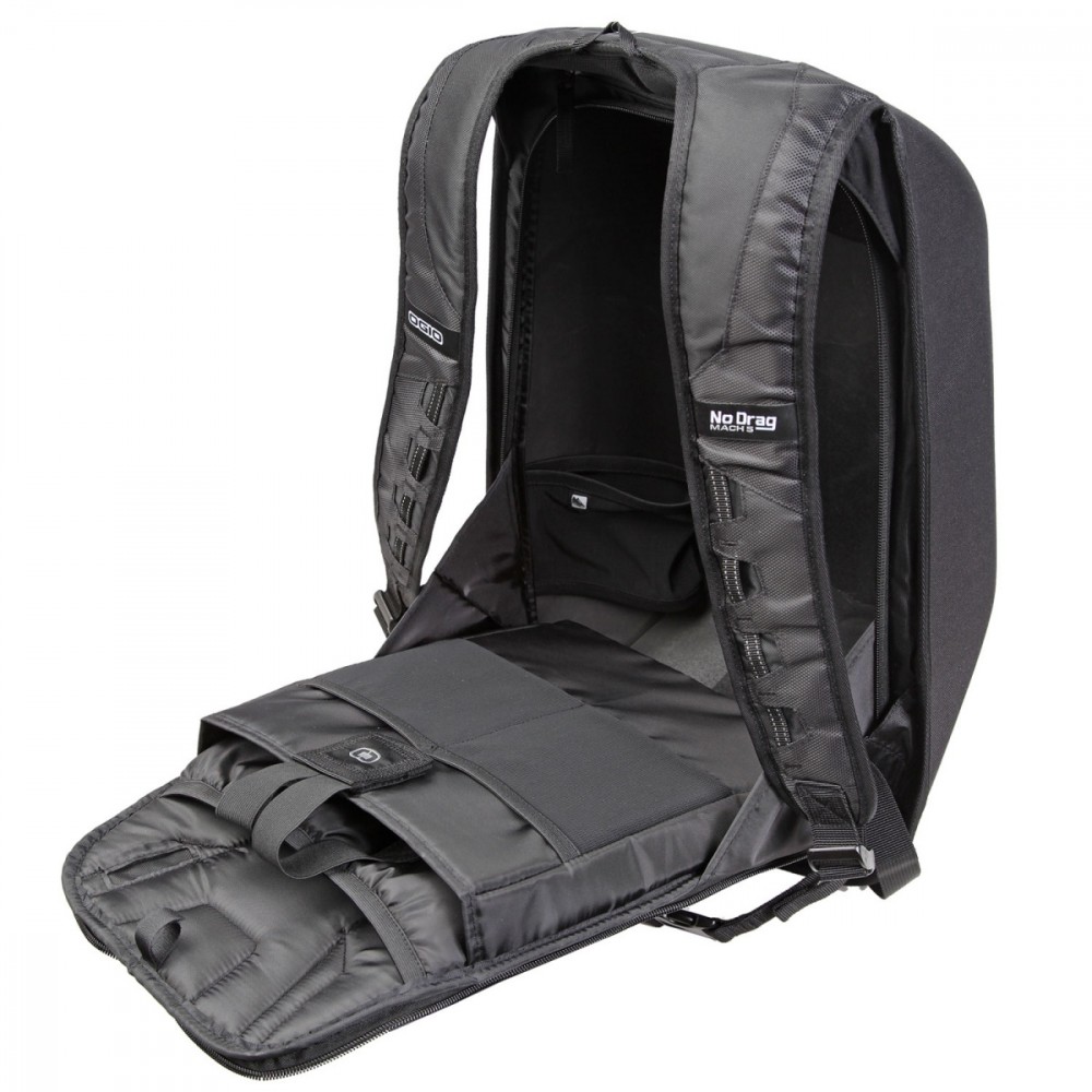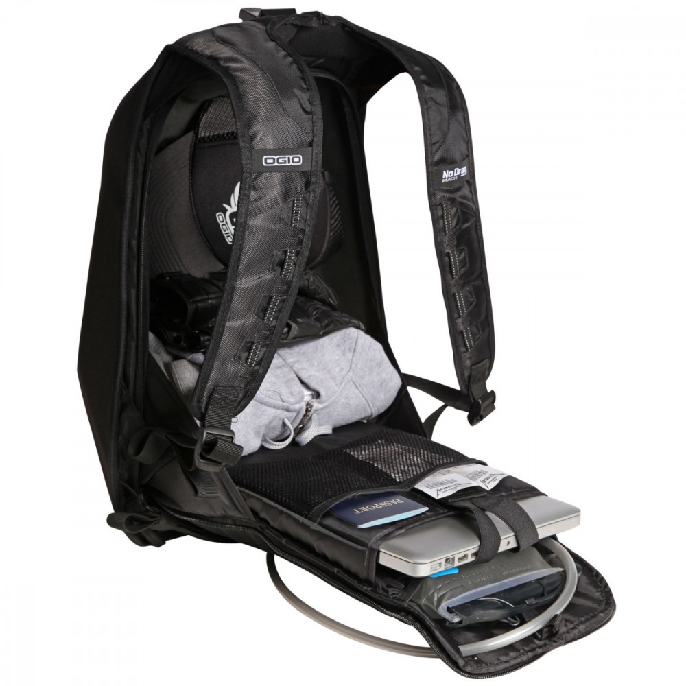 Plecak na laptopa z kieszenią wyściełany materiałem zabezpieczającym przed zarysowaniem Opływowy kształt Zewnętrzna skorupa prawie całkowicie wodoodporna, nie odkształca się od uderzeń wiatru Szelki dopasowujące się do ciała i zwiększają aerodynamikę Odpinany pas biodrowy - nie zarysuje zbiornika paliwa Duża komora główna z kilkoma mniejszymi, wielofunkcyjnymi kieszeniami w środku Dobrze zorganizowany panel wewnętrzny Aerodynamiczny, schowany uchwyt do przenoszenia plecaka W pełni regulowany i odpinany, nie ślizgający się pasek piersiowy