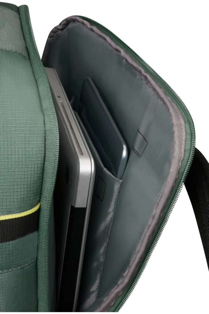 Wnętrze: Kieszeń na laptopa Kieszeń na tablet Wewnętrzny organizator Materiał: tkanina wewnętrzna wykonana z 18 butelek PET pochodzących z recyklingu przy użyciu naszej technologii Recyclex Łatwo dostępna kieszeń przednia Pasy krzyżowe