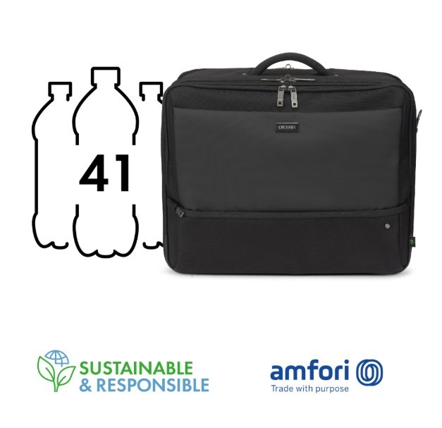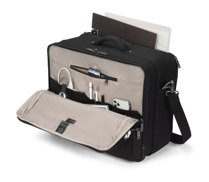 MULTI TWIN FIVE to bezpieczny, funkcjonalny i przyjazny dla środowiska towarzysz codziennych potrzeb biznesowych. Zamykana przegroda na notebooka z pianką HDF zapewnia solidną ochronę, a wewnętrzna przegroda na tablet sprawia, że mniejsze urządzenia są równie bezpieczne. Specjalna tylna przegroda utrzymuje dokumenty w porządku, a przednia część oferuje ustrukturyzowane kieszenie na akcesoria. Ta starannie zaprojektowana dla wygody torba jest również wykonana z 41 przetworzonych butelek PET, łącząc zrównoważony rozwój z codzienną praktycznością.