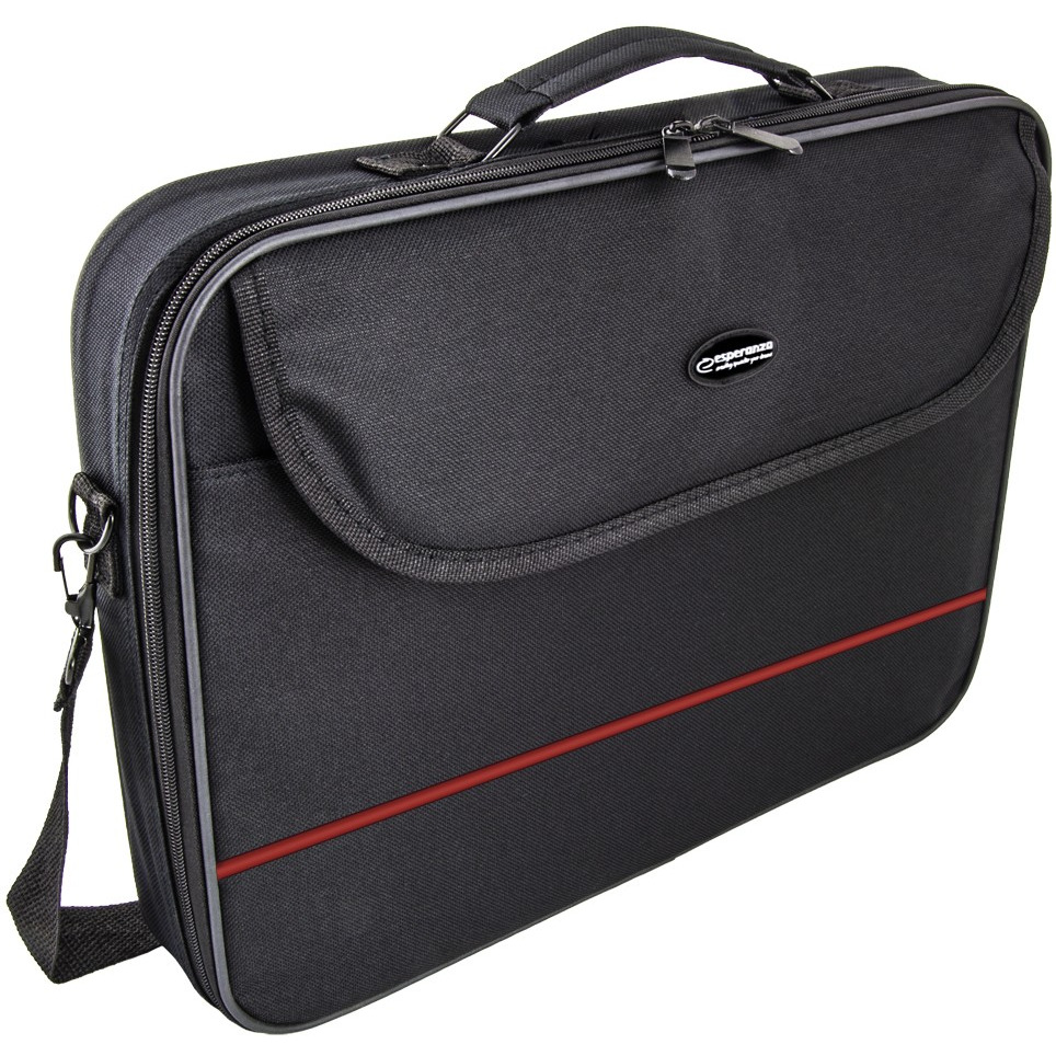 Elegancka torba na notebooka o przękątnej max. 15.6. Regulacja wielkości komory wewnętrznej następuje za pomocą przesuwnej listwy z mocowaniem na rzepach umożliwiając dopasowanie komory do wymiarów notebooka. Torba wykonana jest z wysokiej jakości materiału. Ścianki boczne wzmocnione są listwą metalową, a od wewnątrz wyłożone miękką warstwą pianki skutecznie chroniącej notebook przed uderzeniami i zarysowaniami. Komora notebooka z każdej strony jest wyłożona miękkimi materiałami. Z zewnątrz - z przodu - torba posiada funkcjonalną kieszeń, np. na dokumenty. Wewnątrz torby znajduje się druga kieszeń oraz pasek dodatkowo przytrzymujący notebook. Metalowe zawiasy uchwytu i paska naramiennego gwarantują dużą wytrzymałość i niezawodność. Regulowany pasek na ramię mocowany jest za pomocą bardzo praktycznych, metalowych karabińczyków, a w swojej środkowej części pasek posiada gumową nakładkę zwiększającą komfort noszenia.