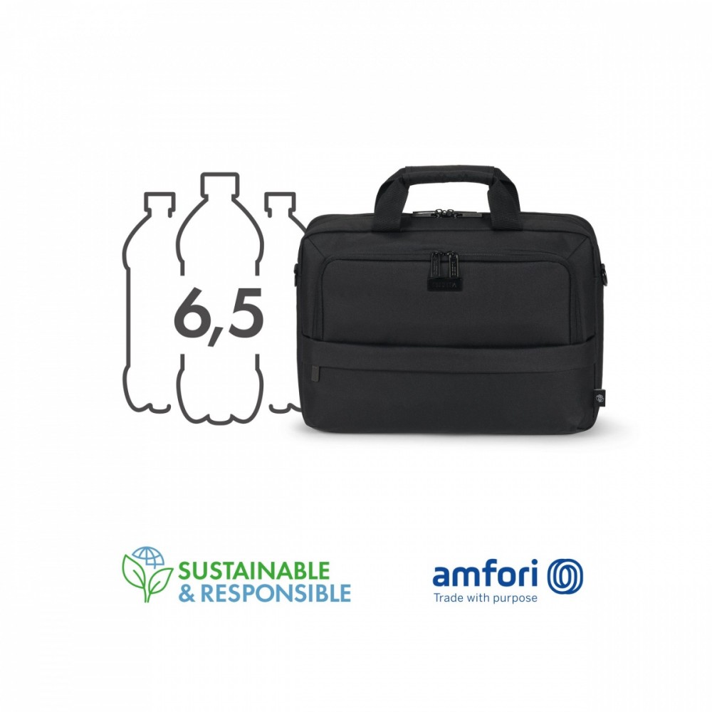 Dzisiejsze działania kształtują świat jutra. Dlatego właśnie w DICOTA poświęcamy się opracowywaniu rozwiązań przyjaznych dla środowiska i dlatego wszystkie produkty z naszych kolekcji ECO produkujemy z ekologicznego, pochodzącego z recyklingu PET. Ponownie wykorzystujemy aż 36 butelek PET, dzięki czemu otrzymasz produkt przyjazny dla środowiska z dożywotnią gwarancją. Nasze produkty PET mają również jakość, wygląd i wykończenie, które znasz i kochasz. Wykonane z 6,5 butelek PET pochodzących z recyklingu Wyściełana komora na notebooka z pianką o dużej gęstości (HDF) Przednia komora z kieszeniami na akcesoria mobilne Kieszeń na zamek błyskawiczny na zasilacz i kabel Ukryta komora na lokalizator GPS Kieszeń zapinana na zamek z blokadą RFID Kieszeń na dokumenty z tyłu Wyściełany pasek na ramię Materiał wodoodporny