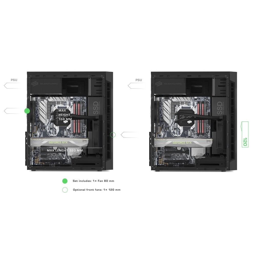 Konstrukcja obudowy SilentiumPC Armis AR1 została zoptymalizowana pod kątem przepływu powietrza. Standardowo zainstalowany z tyłu wentylator poprawia chłodzenie zainstalowanych w środku komponentów. Użytkownik ma możliwość zamontować drugi, 120-milimetrowy, wentylator z przodu, który dodatkowo usprawni wentylację w środku obudowy. O czystość dbają dwa filtry przeciwkurzowe zamontowane z przodu, w bocznych sekcjach panelu frontowego.