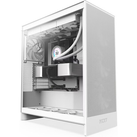 H7 Flow rewolucjonizuje chłodzenie GPU w klasycznej obudowie mid-tower. Pionowy układ zasilacza zapewnia miejsce na 3 dolne wentylatory 120 mm, oferując wydajne chłodzenie bez zwiększania powierzchni obudowy.