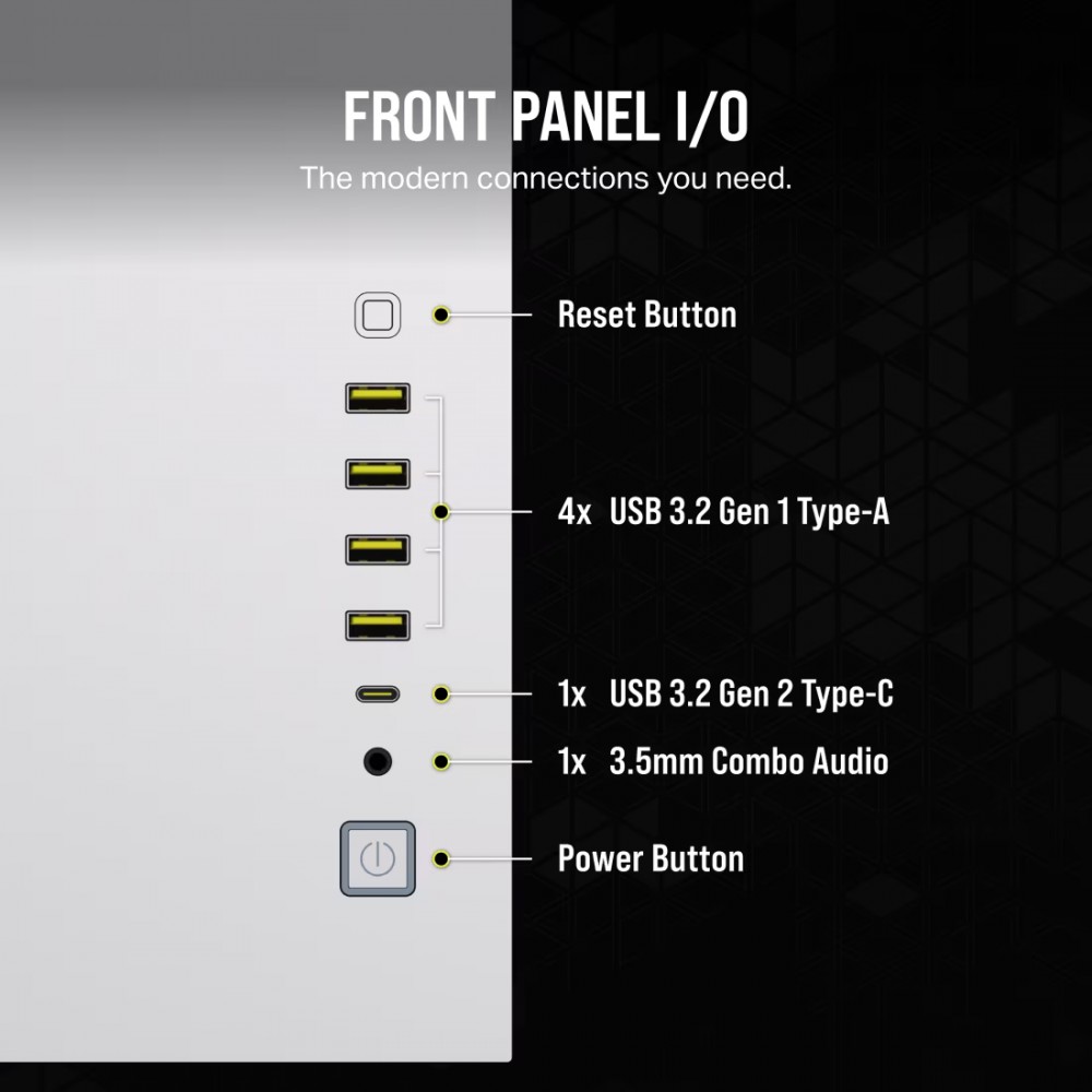 Złącza na przednim panelu: Reset, Power, 1 x mikrofon/słuchawki (combo), 1 x USB Typ C, 4 x USB 3.2 Gen1