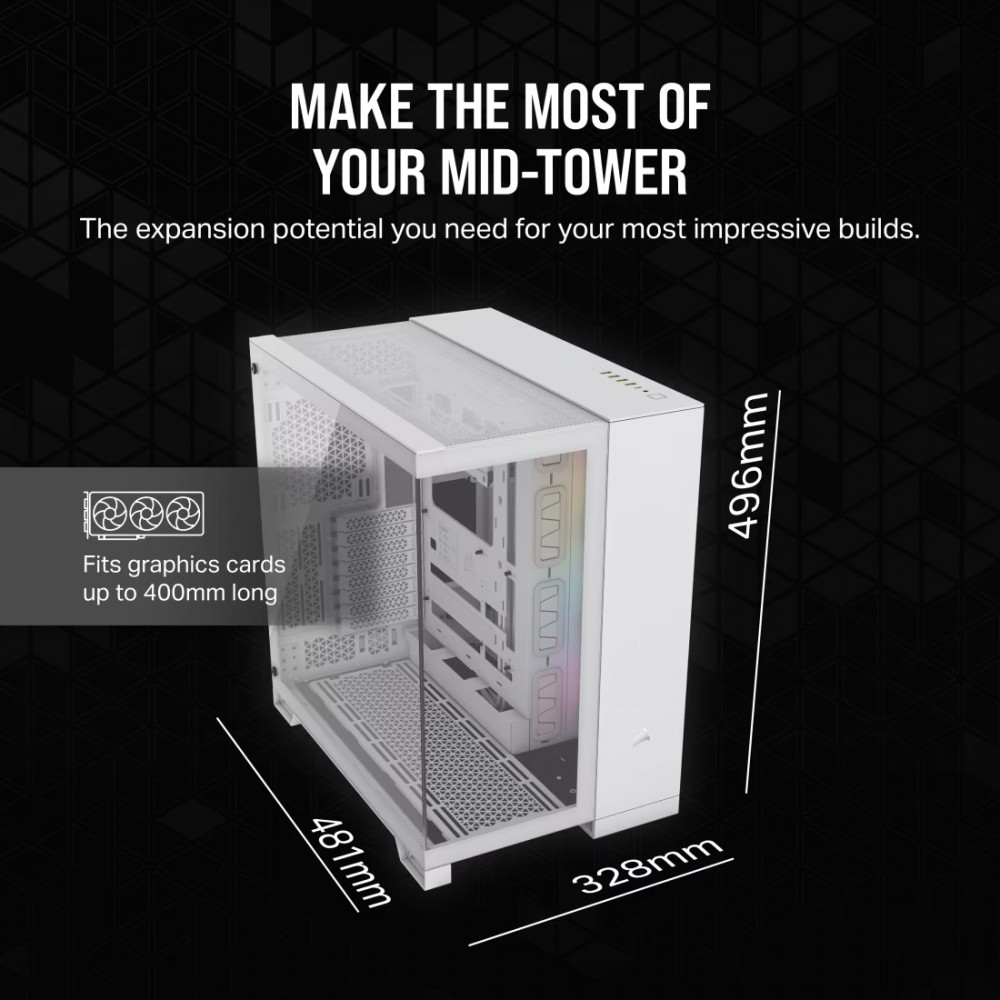 Obudowa komputera Mid-Tower z dwiema komorami CORSAIR iCUE LINK 6500X RGB umożliwia budowę schludnego komputera SFF, którego wnętrze z dwoma instalowanymi fabrycznie wentylatorami RX120 RGB można podziwiać przez trzy panele ze szkła hartowanego. Dwie komory nadają uporządkowany wygląd W komplecie zestaw wentylatorów iCUE LINK (3 wentylatory RX RGB i koncentrator systemowy) Działa z płytami głównymi mATX i mITX z odwróconymi złączami Mnóstwo opcji personalizacji Efektowne panele szklane