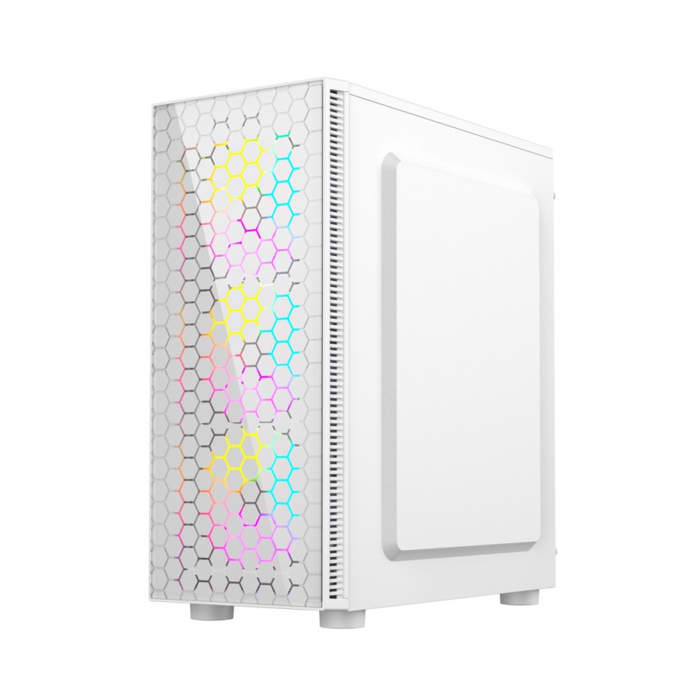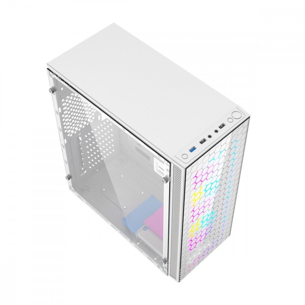 Obudowa komputerowa gamingowa Fornax 500, biała Efektowne ARGB na panelu przednim - zainstalowane 3 wentylatory Zmiana koloru za pomocą przycisku Szklany panel boczny Szybki port USB 3.1