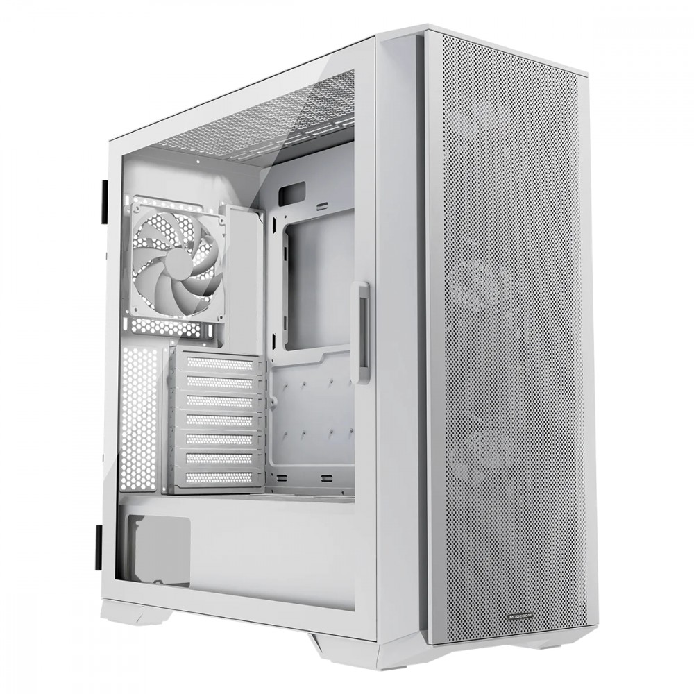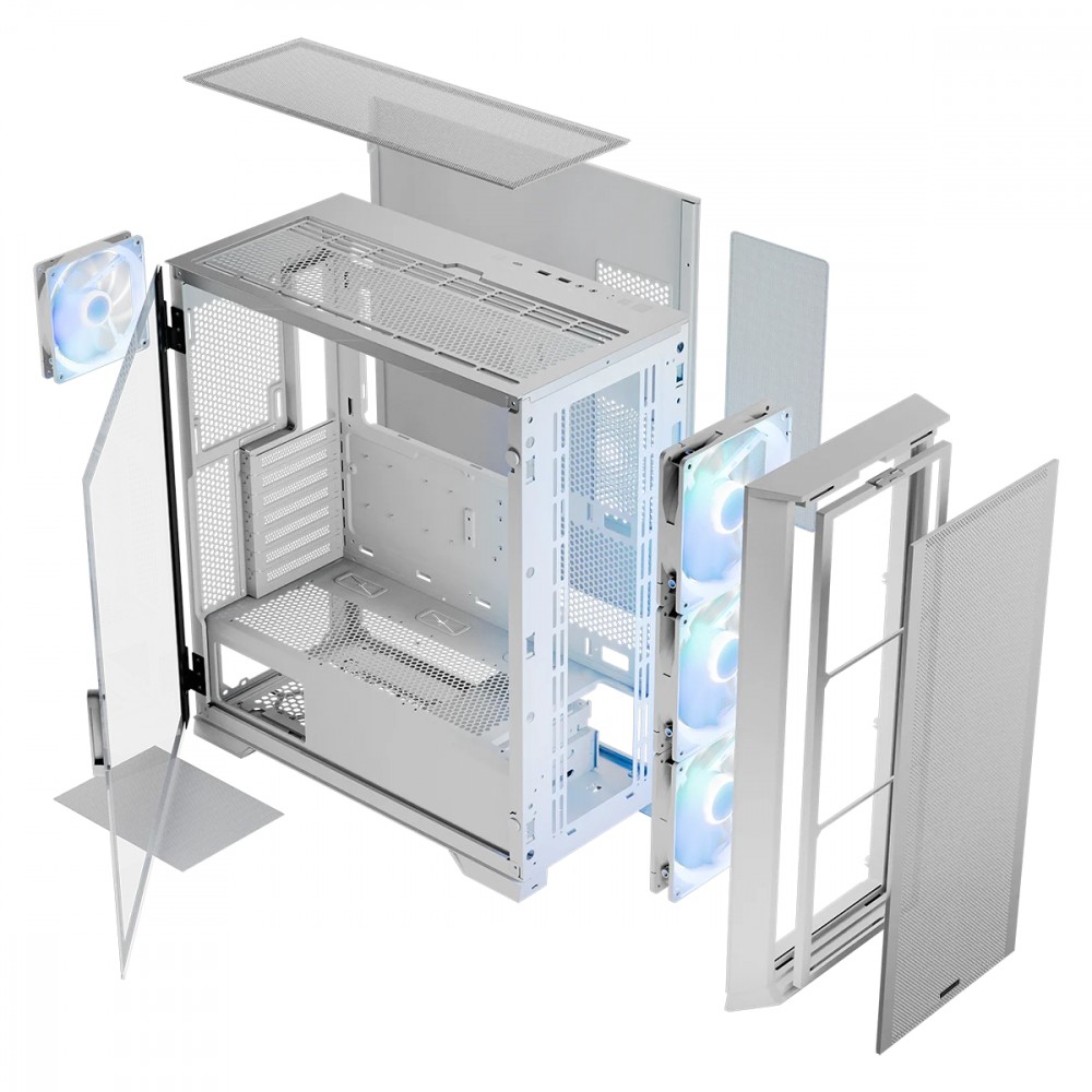 W obudowie zainstalowane zostały trzy 140 milimetrowe wentylatory ARGB na froncie, wtłaczające powietrze do wnętrza komputera, natomiast jeden 120 mm ARGB, zamontowany na panelu tylnym, ma za zadanie wydmuchiwać gorące powietrze na zewnątrz. 3 wentylatory 140 mm ARGB fabrycznie zainstalowane na froncie obudowy. 1 wentylator 120 mm ARGB fabrycznie zainstalowany na tyle obudowy. Szklany panel boczny w postaci otwieranych drzwiczek na zawiasach. Przewiewny panel frontowy i górny. 2 x USB 3.0 oraz 1 x USB-C. Wykręcane śledzie na sloty PCI-E. Możliwość montażu płyt głównych E-ATX. Gotowa na montaż chłodzenia wodnego. Tunel na zasilacz. Dostępna w modnej bieli lub eleganckiej czerni. Cztery filtry przeciwkurzowe dół, góra, front i bok obudowy. Łatwo demontowalna siatka mesh na froncie. Miejsce na 4 dyski twarde (w konfiguracji 2 SSD / 2 HDD lub 3 SSD / 1 HDD lub 4 SSD). Kontroler wentylatorów ARGB.