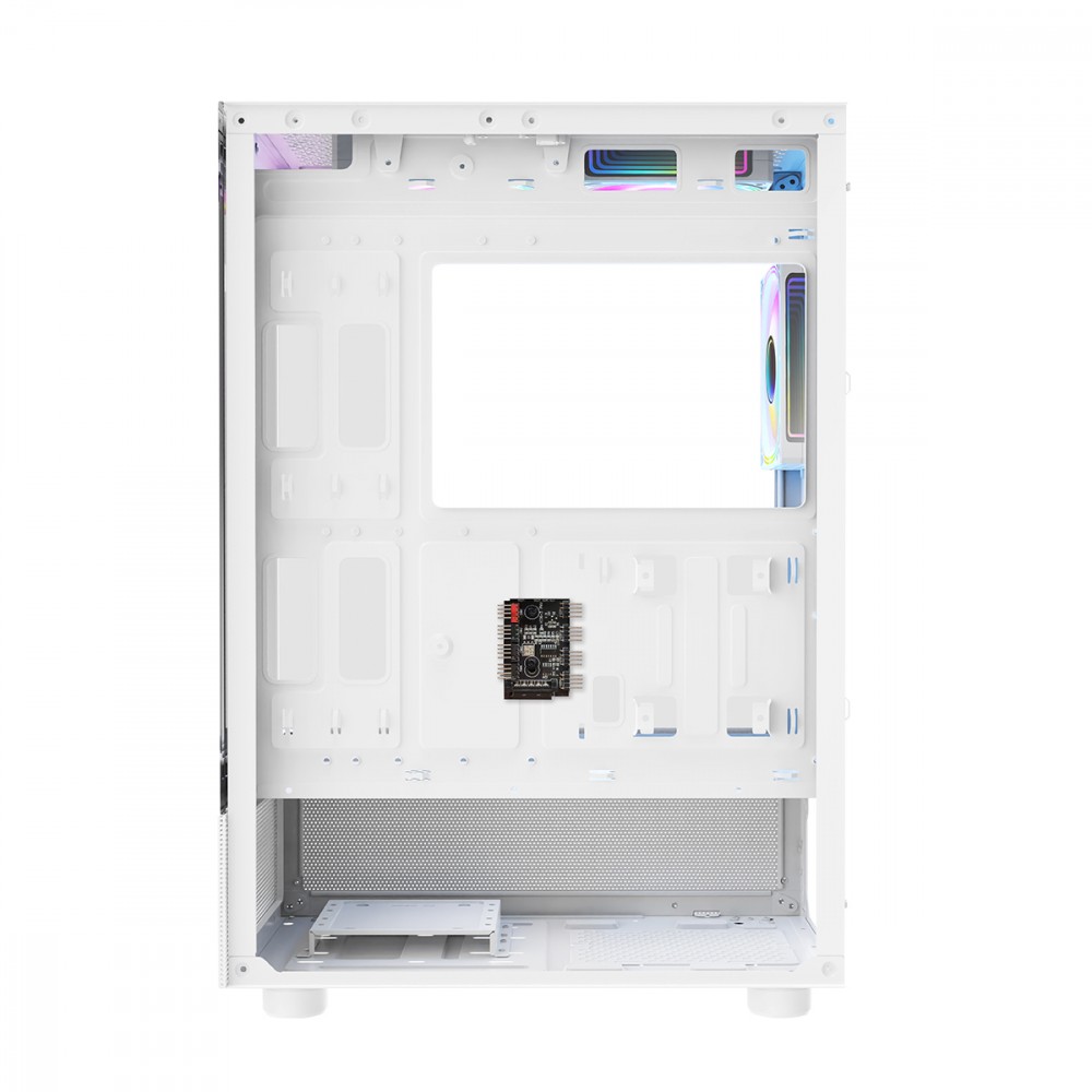 W obudowie zainstalowane zostały trzy 120 mm wentylatory ARGB. W celu zachowania jak najlepszego obiegu powietrza wentylator zamontowany z tyłu wyciąga gorące powietrze. Tak samo pracuje również jeden z wentylatorów na górze tuż nad procesorem. Drugi z kolei ten zamontowany najbliżej panelu przedniego wtłacza zimne powietrze do środka. Dzięki takiemu systemowi pracy, trzy wentylatory w najlepszy możliwie sposób chłodzą wnętrze komputera.