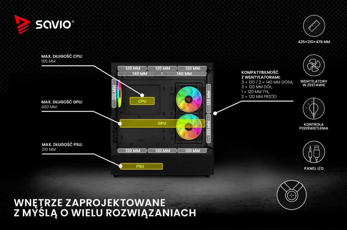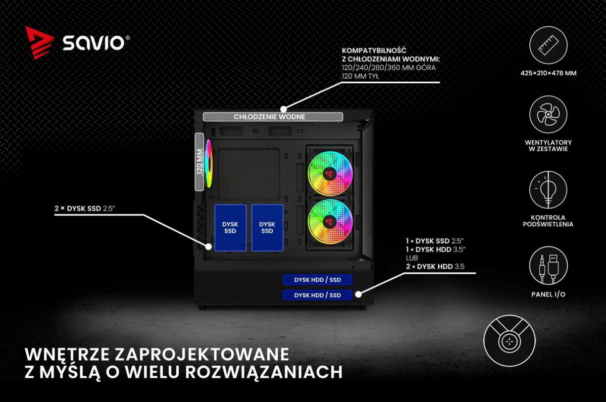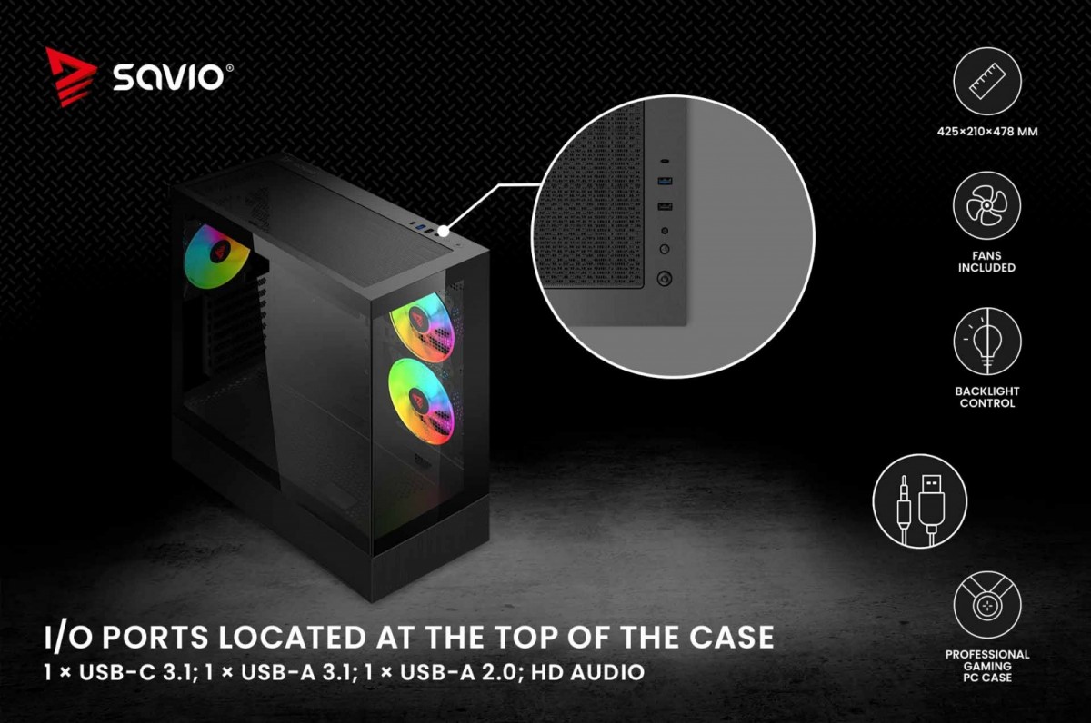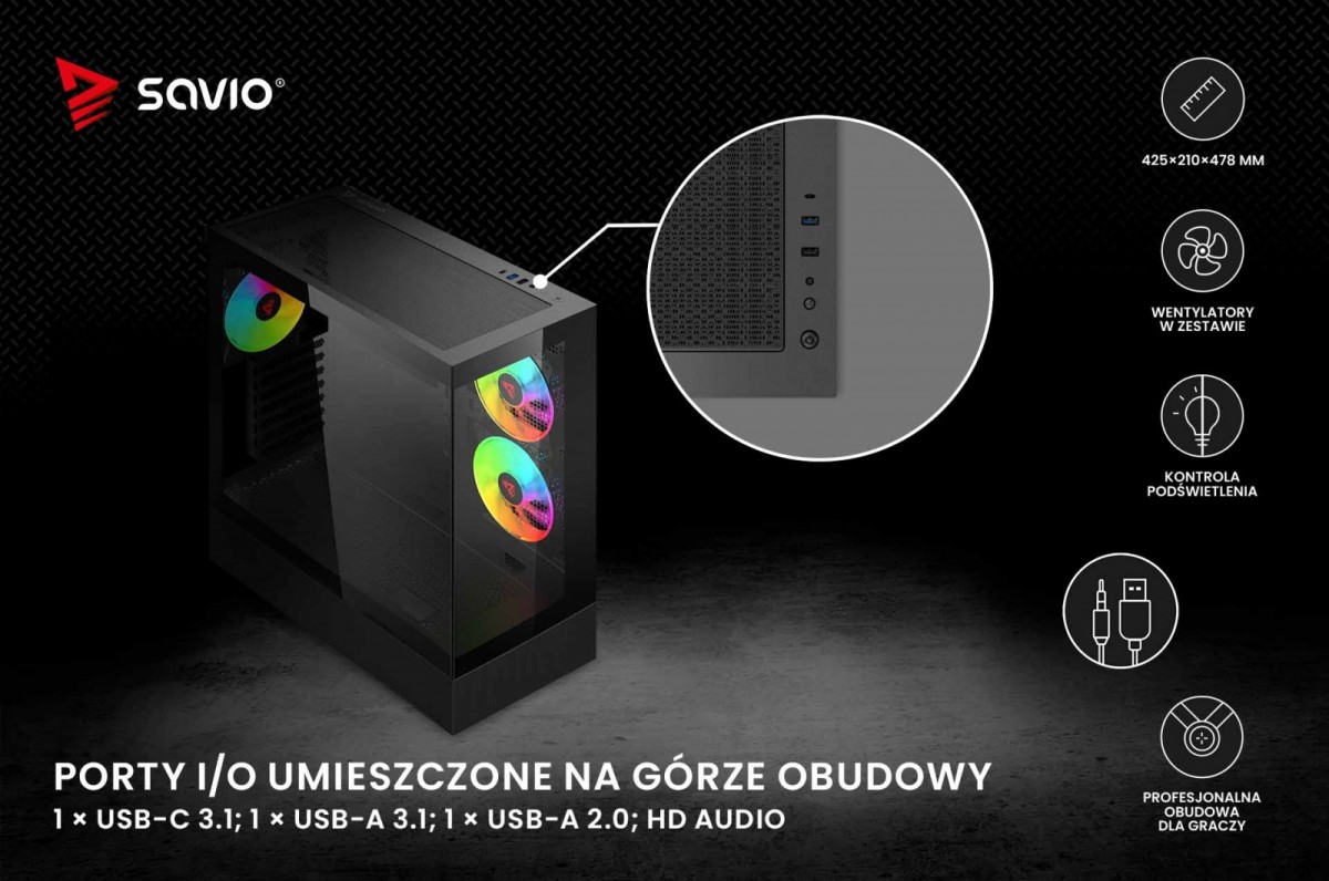 Panel I/O w Savio SIGMA X1 wyposażono w standardowe przyciski, takie jak włączenia oraz RESET/LED, wejście dla mikrofonu lub słuchawek oraz trzy porty: USB 2.0, USB-A Gen 1 i USB-C 3.1 Gen 1. Zapewnia to szybkie i wygodne podłączanie różnorodnych urządzeń zewnętrznych do komputera.