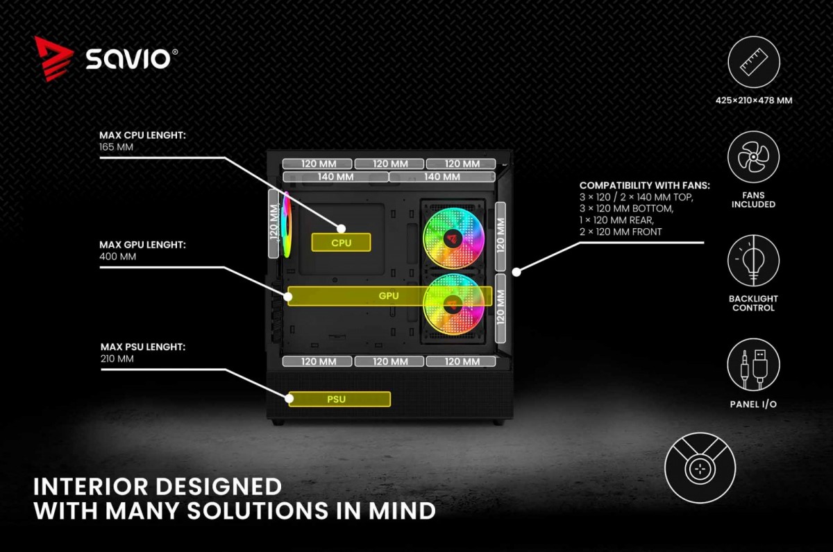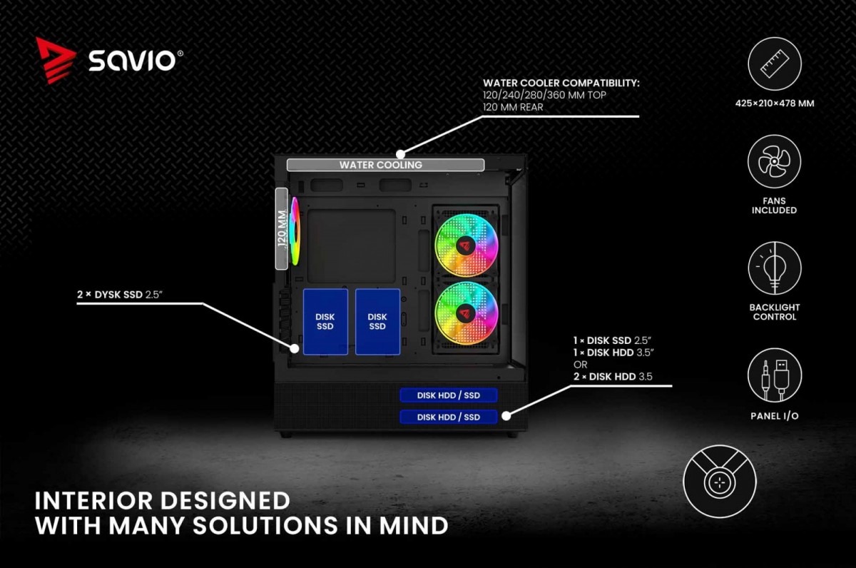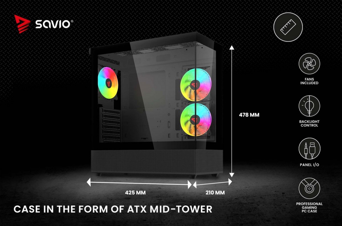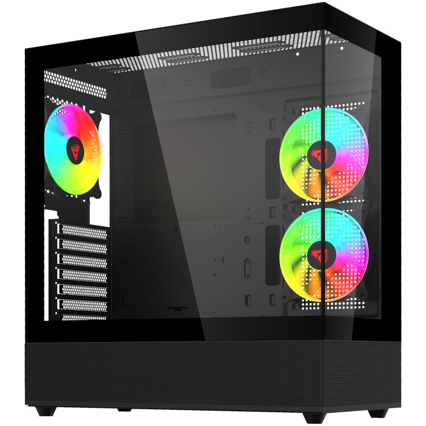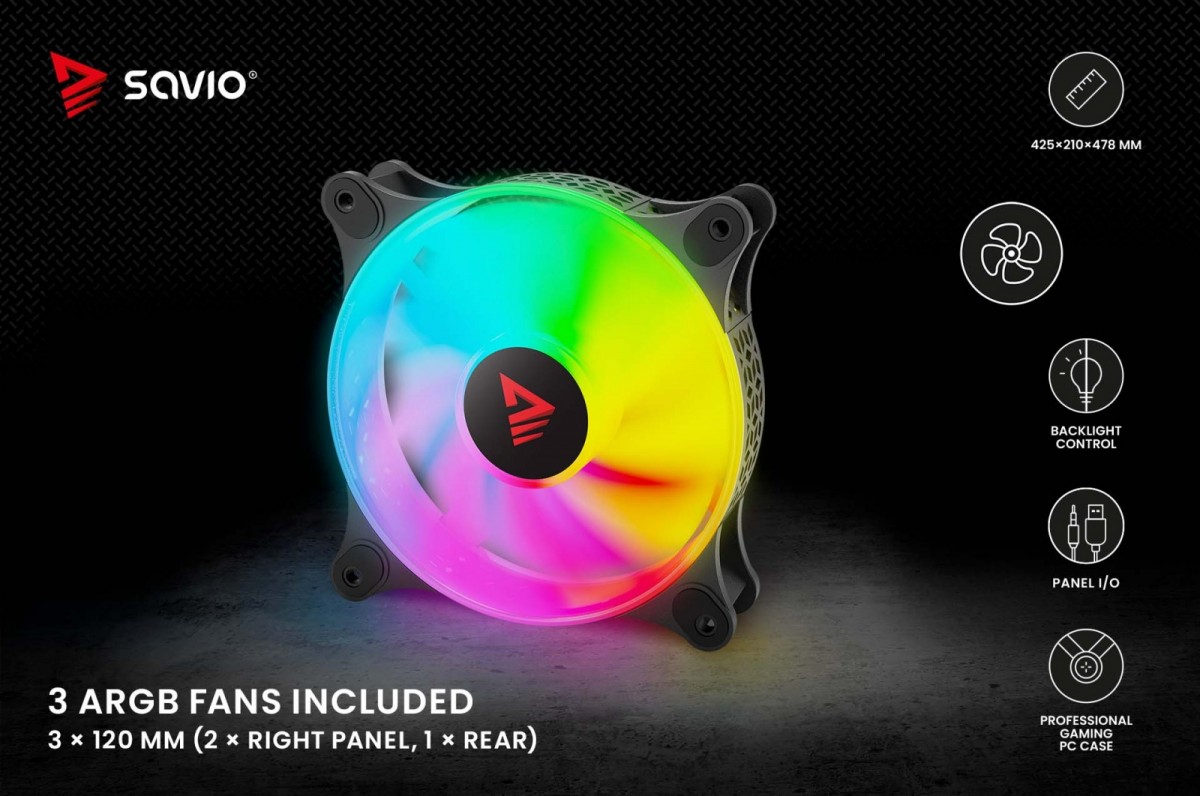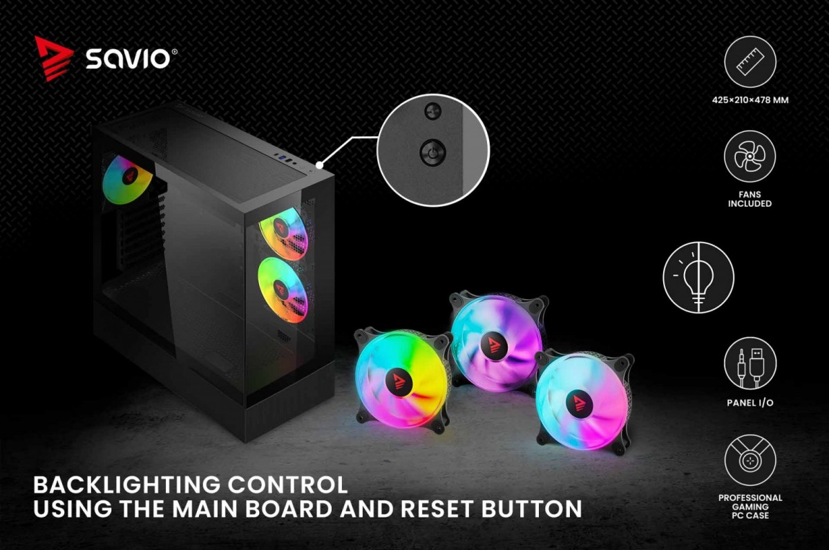 Dwa panele ze szkła. Skuteczna ochrona i dobre chłodzenie komponentów. Szeroka kompatybilność zastosowania chłodzenia wodnego. System kontroli podświetlenia z płyty głównej i przycisku reset. System kontroli prędkości za pomocą bios lub oprogramowania płyty głównej. Trzy wentylatory 120 mm w zestawie. Możliwość zainstalowania wielu wentylatorów wewnątrz obudowy. Unikalny kształt i nowoczesny wygląd.