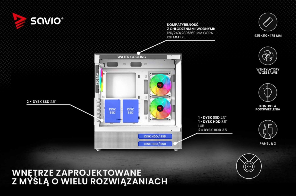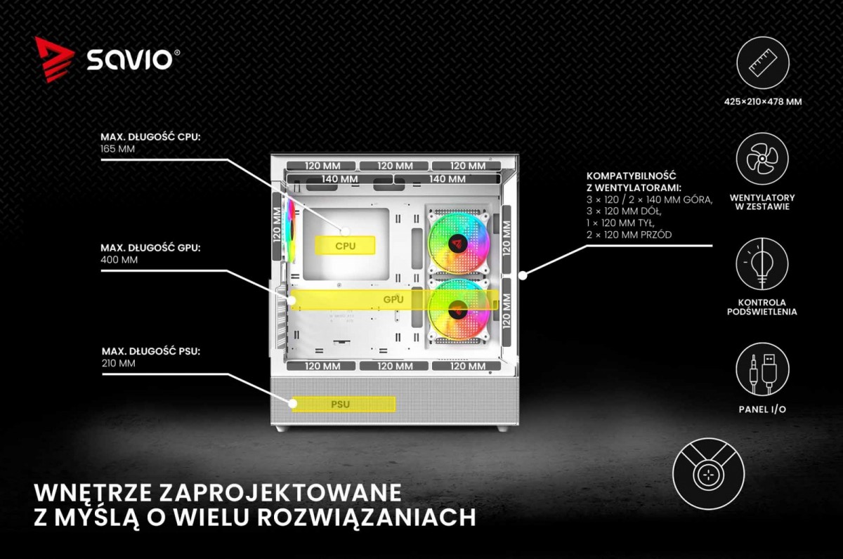 Panel I/O w Savio SIGMA X1 White wyposażono w standardowe przyciski, takie jak włączenia oraz RESET/LED, wejście dla mikrofonu lub słuchawek oraz trzy porty: USB 2.0, USB-A Gen 1 i USB-C 3.1 Gen 1. Zapewnia to szybkie i wygodne podłączanie różnorodnych urządzeń zewnętrznych do komputera.