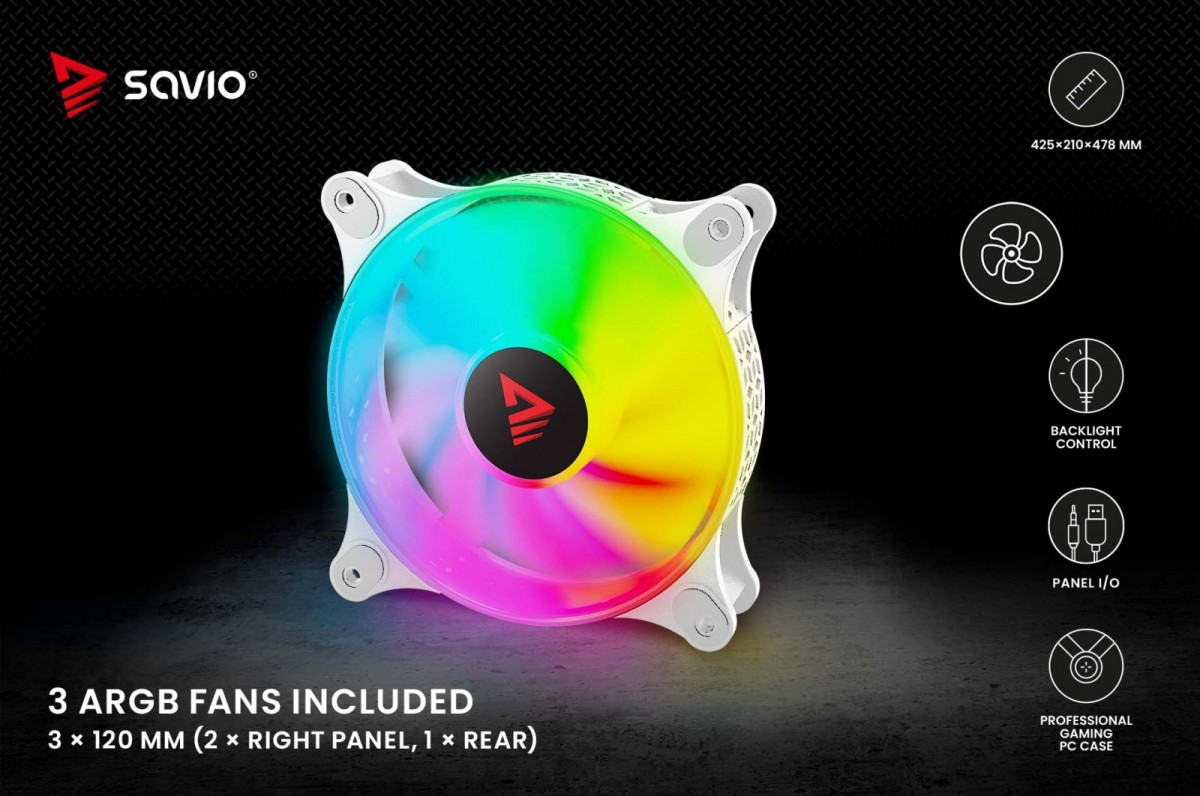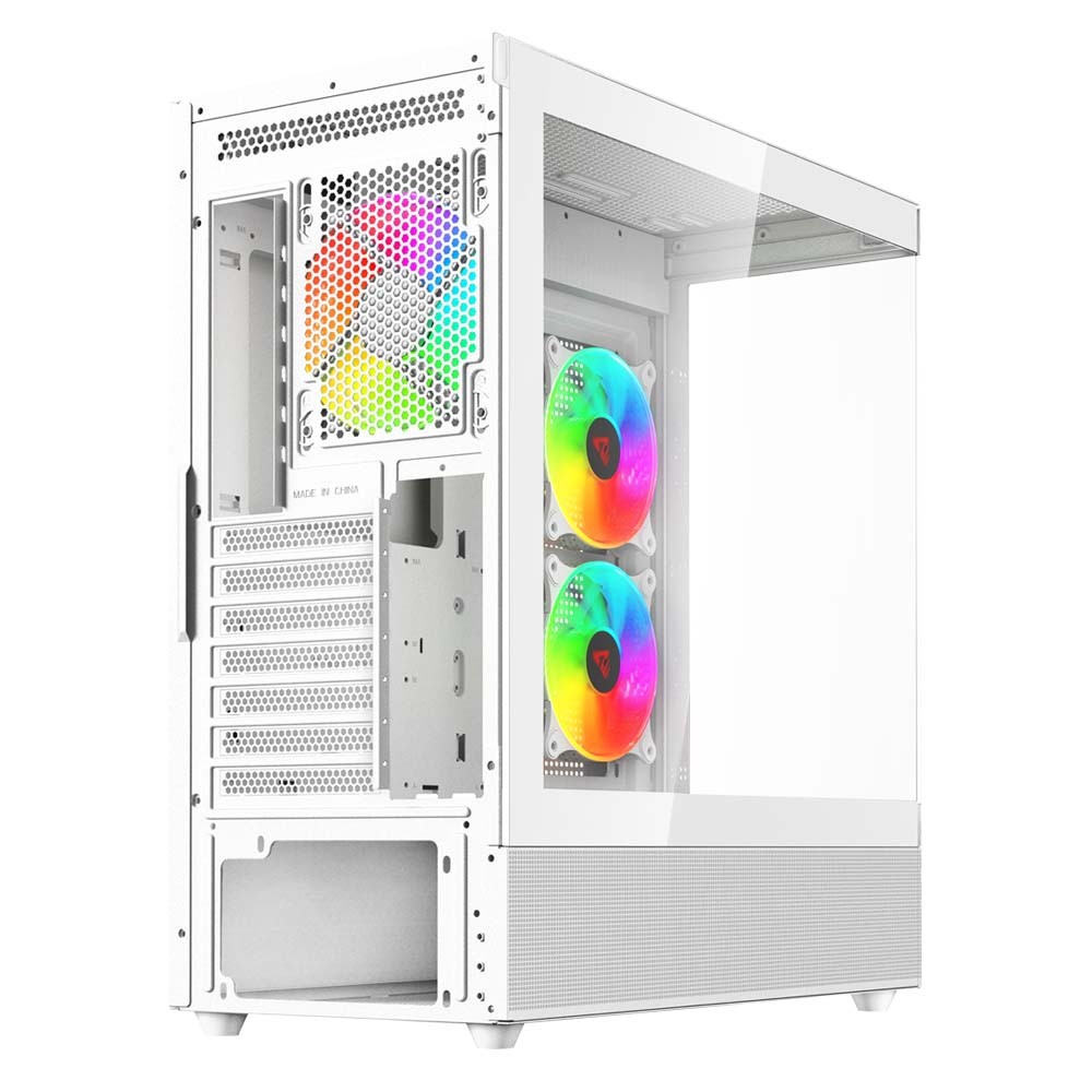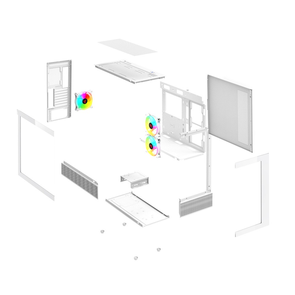 Specyfikacja techniczna: Rodzaj obudowy: ATX Mid-Tower Kompatybilność płyty głównej: ATX, mATX, ITX Wspierane formaty dysków: 2 × HDD (3.5) + 2 × SSD (2.5) lub 1 × HDD (3.5) + 3 × SSD (2.5) Porty I/O: 1 × USB-C 3.1 Gen 1; 1 × USB-A 3.1 Gen 1; 1 × USB-A 2.0; HD audio Panel boczny: Tempered glass/Szklany Maksymalna długość VGA: 400 mm (vertical/pionowy) Panel przedni: Tempered glass/Szklany Maksymalna wysokość chłodzenia procesora: 165 mm Obsługiwane typy zasilaczy: Wszystkie typy zasilaczy standardowych/pół modularnych i modularnych Gniazda rozszerzeń PCI: 7 Filtr przeciwkurzowy: 1 × góra, 1 × dół (PSU) Warianty kontroli wentylatorów: Płyta główna/Przycisk LED Wentylatory w zestawie: 3 × 120mm ARGB, PWM, 800-1800 RPM (2 × rprawy panel, 1 × tył) Obsługiwane wentylatory:-panel prawy 2 × 120 mm- tył 1 × 120 mm lub 2 × 140 mm- dół 3 × 120 mm Wsparcie dla chłodzenia wodnego:- tył 1 × 120 mm- góra 1 × 120/240/280/360 mm Rozmiary produktu: (L × W × H) 425 × 210 × 478 mm Materiał obudowy: SPCC 0.7 mm Waga netto/brutto: 6,7/7,7 kg