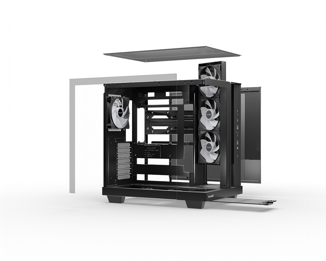 Kątowa ramka wentylatora jest nie tylko świadectwem elegancji i funkcjonalności, ale także kieruje więcej powietrza w stronę GPU - części, która tradycyjnie wymaga go dużo. Zapewnia ona zgrabne wycięcie, które działa jako wydajny wlot powietrza. Aby ułatwić instalację wentylatorów, wysuwa się ona do góry. Zarządzanie przewodami jest łatwiejsze niż kiedykolwiek wcześniej dzięki kanałowi, który elegancko ukrywa Twój sprzęt. Jeśli zainstalujesz dodatkowe wentylatory w dolnej części, będą one idealnie dopasowane do podłogi obudowy dzięki obniżonej wnęce wentylatora.