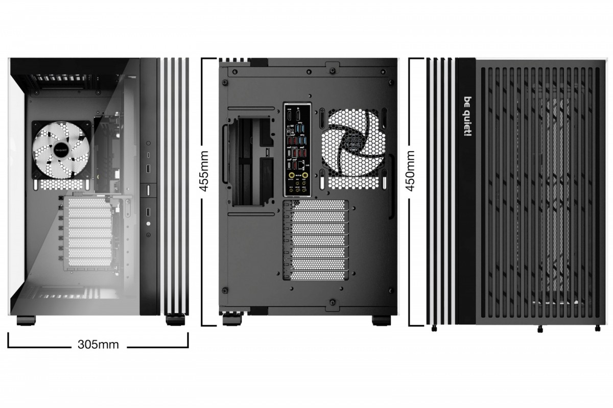 Obudowa Light Base 600 LX Black jest dostarczana z 4 fabrycznie zainstalowanymi wentylatorami Light Wings LX. Jeden wentylator jest zainstalowany jako tylny wylot, 3 wentylatory Light Wings LX 120mm PWM z odwróconymi łopatkami są zainstalowane w panelu bocznym. Odwrócone wentylatory sprawiają, że konfiguracja nadal przyciąga wzrok, przy bocznym wlocie powietrza. Ich 7 zoptymalizowanych pod kątem przepływu powietrza łopatek wentylatora nie tylko redukuje turbulencje generujące hałas, ale także zapewnia, że wentylator ten osiąga wymaganą wydajność, nawet w wymagających konfiguracjach.