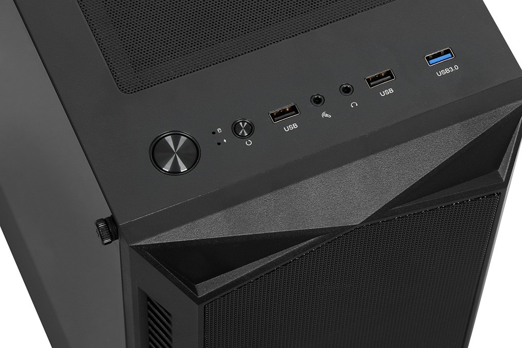 Złącza na przednim panelu: 1 x mikrofon, 2 x USB 2.0, Reset, Power, 1 x USB 3.0, 1 x słuchawki