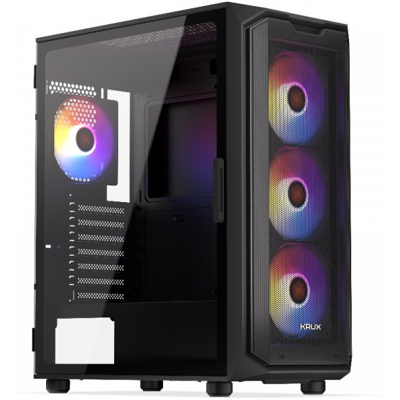 Krux Orona główne cechy: Przepuszczający powietrze panel frontowy Szklany panel boczny na zawiasach Cztery wentylatory RGB Pojemna konstrukcja Trzy filtry przeciwkurzowe