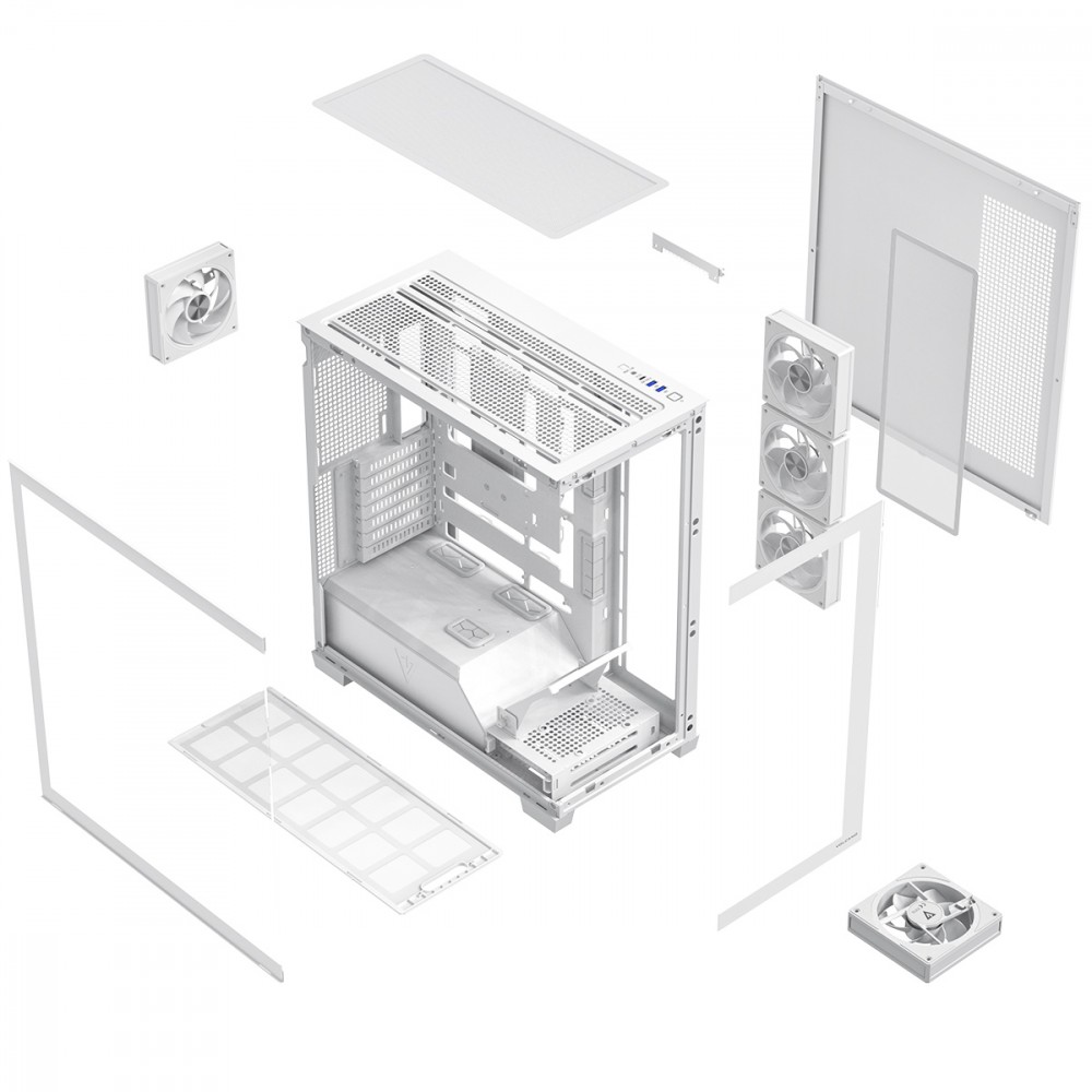 Pięć wentylatorów PWM ARGB w standardzie. Obudowa gotowa jest do montażu podzespołów po wyjęciu z pudełka. Kontroler wentylatorów w standardzie. Efektowny pasek LED ARGB na tunelu zasilacza.