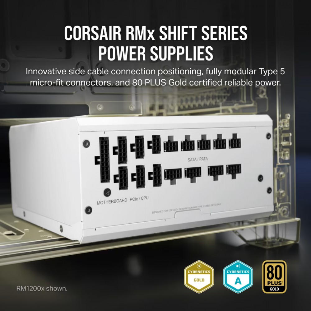 W pełni modułowe zasilacze CORSAIR RMx SHIFT Series wyróżniają się przełomowym bocznym złączem. Dzięki temu wszystkie połączenia są łatwo dostępne, a komputer można wygodnie zasilać ze sprawnością 80 PLUS Gold.