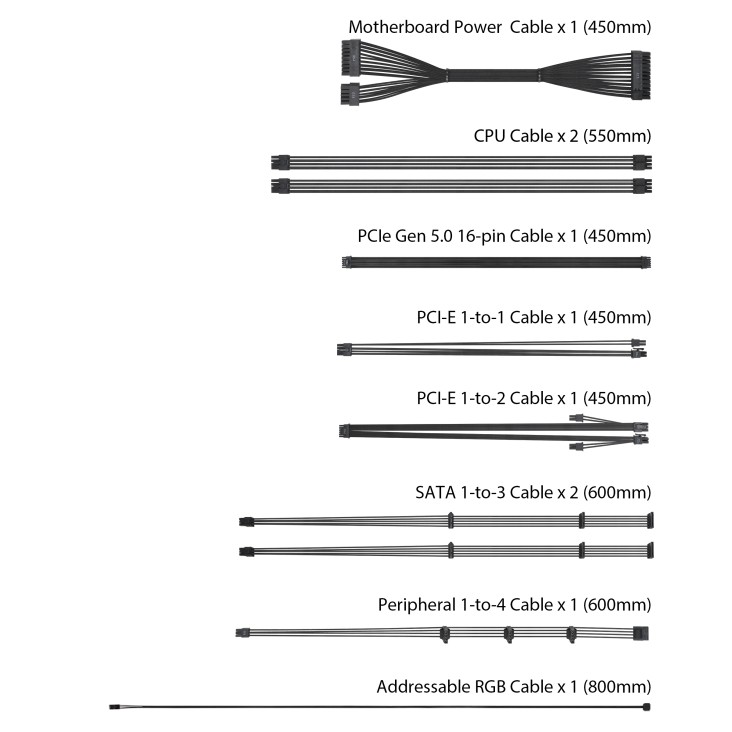 Akcesoria w zestawie: Przewód zasilający Kabel zasilający płyty głównej (450 mm) 2 x Kabel procesora (550 mm) 16-pinowy kabel PCI-E Gen 5 (450 mm) Kabel PCI-E (16-pinowy do 8-pin-8-pinowy) (450 mm) Kabel PCI-E 1 do 1 (450 mm) 2 x Kabel SATA 1 do 3 (300+200+100mm) Kabel peryferyjny 1 do 4 (300+100+100+100mm) Adresowalny kabel RGB (800 mm) Instrukcja obsługi Wspornik adaptera ATX na SFX