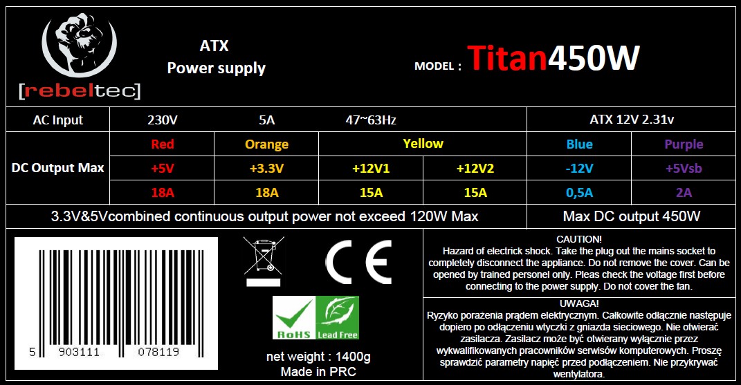 Zasilacz uniwersalny komputerowy ATX ver. 2.31 REBELTEC TITAN 450