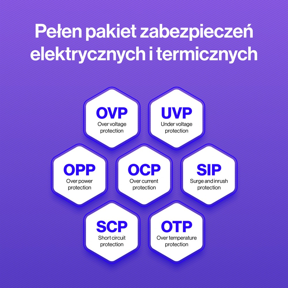 Zabezpieczenia / filtry: Przed zbyt wysokim prądem (OCP), Termiczne (OTP), Przeciwprzeciążeniowe (OPP), Przeciwprzepięciowe (OVP), Przed przepięciami i udarami (SIP), Przeciwzwarciowe (SCP)