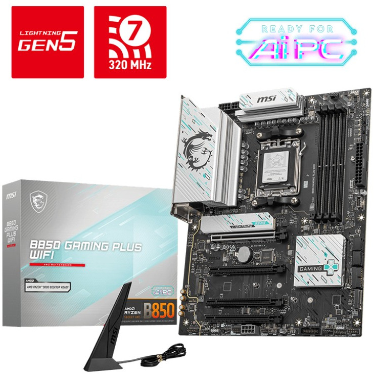 B850 GAMING PLUS WIFI został stworzony, aby oferować rozbudowaną łączność, wszechstronne narzędzia i najwyższej jakości rozwiązanie Wi-Fi dla graczy poszukujących kompleksowych wrażeń. Wyposażony w pełną prędkość Wi-Fi 7, 5G LAN, rozwiązanie PCIe 5.0, dodatkowe zasilanie PCIe i ekskluzywne funkcje EZ DIY, jest gotowy do całodobowej, nieprzerwanej gry zoptymalizowanej pod kątem procesorów AMD Ryzen serii 9000. Obsługuje procesory stacjonarne AMD Ryzen serii 9000 / 8000 / 7000 Obsługuje pamięć DDR5, dwukanałową DDR5 8200+ MT/s (OC) Ultra wydajność: 12+2+1 Duet Rail Power System, dwa 8-pinowe złącza zasilania procesora, Core Boost, Memory Boost, 6-warstwowa płytka PCB wykonana z 2-uncjowej pogrubionej miedzi i materiału klasy serwerowej Frozr Guard: rozszerzony radiator, podkładki termiczne MOSFET o wartości 7 W/mK, dodatkowe podkładki termiczne dławików i osłona EZ M.2 Frozr II są zbudowane z myślą o wysokiej wydajności systemu i nieprzerwanym działaniu Szybka łączność: 5G LAN z rozwiązaniem Wi-Fi 7 o pełnej prędkości - najnowsze rozwiązanie do zastosowań profesjonalnych i multimedialnych, zapewniające bezpieczne, stabilne i szybkie połączenie sieciowe i transmisję danych Błyskawiczne wrażenia z gry: gniazdo PCIe 5.0, Lightning Gen 5 x4 M.2, przedni port USB typu C EZ DIY: EZ M.2 Shield Frozr II, EZ M.2 Clip II, EZ PCIe Clip II i EZ Antenna Audio Boost: Nagradzaj swoje uszy jakością dźwięku klasy studyjnej, aby uzyskać najbardziej wciągające wrażenia z gry