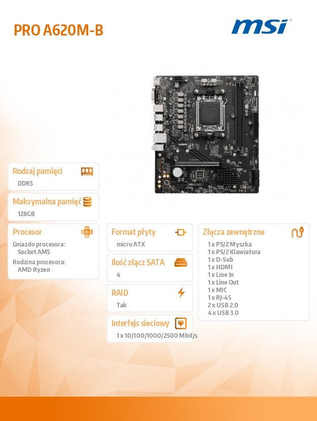 Płyta główna PRO A620M-B Obsługuje procesory stacjonarne AMD Ryzen serii 9000 / 8000 / 7000 Obsługuje pamięć DDR5, dwukanałową DDR5 6800+MHz (OC)...