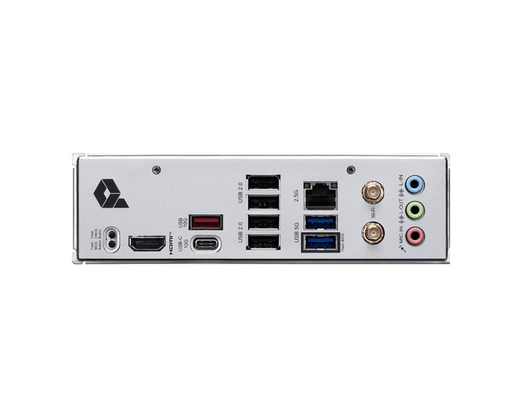 Złącza zewnętrzne: 1 x RJ-45, 1 x Przycisk Clear CMOS, 4 x USB 2.0, 2 x USB 3.2 Gen 1 Type-A, 1 x USB 3.2 Gen 2 Type-A, 1 x USB 3.2 Gen 2 Type-C, 2 x SMA, 1 x MIC (różowy / microphone), 1 x HDMI, 1 x Line In (błękitny), 1 x Line Out (zielony / headphones), 1 x Przycisk BIOS Flash