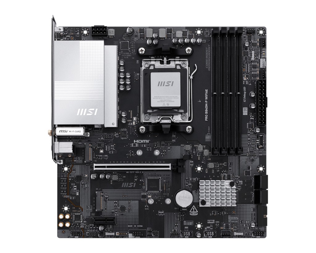 Obudowa PRO B840M-P WIFI6E oferuje prosty design z harmonijną, srebrną kolorystyką, która idealnie pasuje zarówno do białych, jak i czarnych komputerów. Została zaprojektowana z wieloma ekskluzywnymi funkcjami MSI, w tym Wi-Fi 6E z anteną EZ, kartą sieciową 2.5G LAN oraz gniazdem PCIe 4.0 M.2, a także jest gotowa na procesory AMD Ryzen serii 9000.