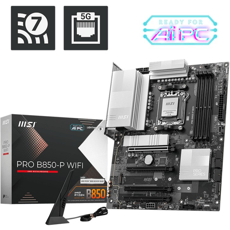 PRO B850-P WIFI oferuje prosty design z harmonijną srebrną kolorystyką, która idealnie pasuje zarówno do białych, jak i czarnych komputerów. Został zaprojektowany z wieloma ekskluzywnymi funkcjami MSI, prawdziwym Wi-Fi 7 z EZ Antenna, 5G LAN, PCIe 5.0 M.2 z EZ M.2 Shield Frozr II i dodatkowym zasilaniem PCIe, gotowy na procesory AMD Ryzen serii 9000.