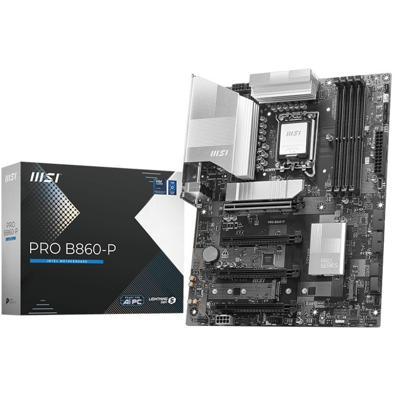 Płyty główne z serii PRO B860-P oferują prosty design z harmonijną, srebrną kolorystyką, która idealnie pasuje zarówno do białych, jak i czarnych zestawów komputerowych. Płyty te charakteryzują się implementacją wielu wyjątkowych funkcji MSI, w tym sieci 5G LAN, złączy Thunderbolt 4, interfejsu PCIe 5.0 M.2 oraz dodatkowym zasilaniem PCIe, dzięki czemu są one przygotowane do obsługi najnowszych procesorów z serii Intel Core Ultra.