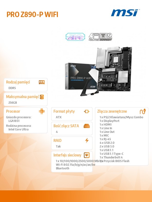 PRO Z890-P WIFI oferuje prosty design z harmonijną srebrną kolorystyką, która idealnie pasuje zarówno do białych, jak i czarnych komputerów. Został zaprojektowany z wieloma ekskluzywnymi funkcjami MSI, prawdziwym Wi-Fi 7 z EZ Antenna, 5G LAN, Thunderbolt 4, PCIe 5.0 M.2 z EZ M.2 Shield Frozr II i dodatkowym zasilaniem PCIe, gotowy na procesory Intel Core Ultra. Obsługa procesorów Intel Core Ultra (seria 2) dla gniazda LGA 1851 Obsługa pamięci DDR5, dwukanałowej pamięci DDR5 9200+ MT/s (OC) Ultra wydajność: 14+1+1+1 Duet Rail Power System 55A DrMOS, dwa 8-pinowe złącza zasilania procesora, Core Boost, Memory Boost, 6-warstwowa płytka PCB wykonana z 2-uncjowej pogrubionej miedzi i materiału klasy serwerowej Frozr Guard: rozszerzony radiator, podkładki termiczne MOSFET o wartości 7 W/mK, dodatkowe podkładki termiczne dławików i EZ M.2 Shield Frozr II są zbudowane z myślą o wysokiej wydajności systemu i nieprzerwanym doświadczeniu EZ DIY: EZ M.2 Shield Frozr II, EZ M.2 Clip II, EZ PCIe Clip II i EZ Antenna Błyskawiczne wrażenia z gry: gniazdo PCIe 5.0, Lightning Gen 5 x4 M.2 Ultra Connect: port Thunderbolt 4, sieć LAN 5G z Intel Rozwiązanie Wi-Fi 7 najnowsze rozwiązanie do zastosowań profesjonalnych i multimedialnych, zapewniające bezpieczne, stabilne i szybkie sieciowanie oraz transmisję danych Wzmocnienie dźwięku: Nagradzaj swoje uszy jakością dźwięku klasy studyjnej, aby uzyskać najbardziej wciągające wrażenia z gry