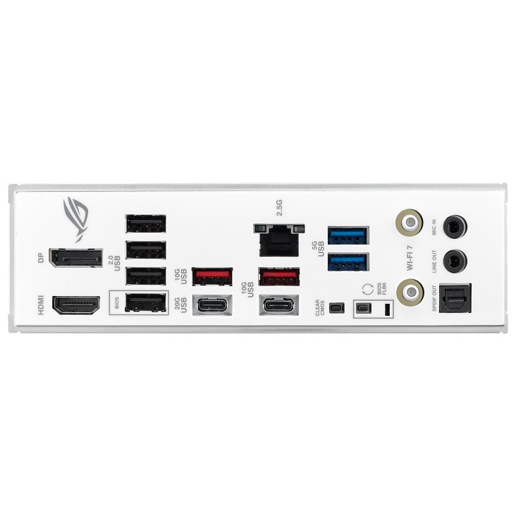 Złącza zewnętrzne: 1 x Przycisk BIOS Flash, 1 x USB4 Typ-C, 1 x Przycisk Clear CMOS, 1 x Line Out (zielony / headphones), 1 x MIC (różowy / microphone), 1 x RJ-45, 1 x S/PDIF, 4 x USB 2.0, 2 x USB 3.2 Gen 1 Type-A, 2 x USB 3.2 Gen 2 Type-A, 1 x USB 3.2 Gen 2 Type-C, 1 x HDMI, 1 x DisplayPort, 1 x Wi-Fi Module