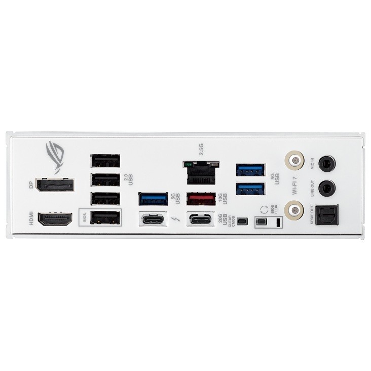 Złącza zewnętrzne: 1 x Przycisk Clear CMOS, 1 x Thunderbolt 4, 1 x HDMI, 1 x Line Out (zielony / headphones), 1 x MIC (różowy / microphone), 1 x RJ-45, 1 x S/PDIF, 4 x USB 2.0, 3 x USB 3.0, 1 x USB 3.2 Gen 2 Type-A, 1 x Przycisk USB BIOS Flashback, 1 x DisplayPort, 1 x USB 3.1 Type-C