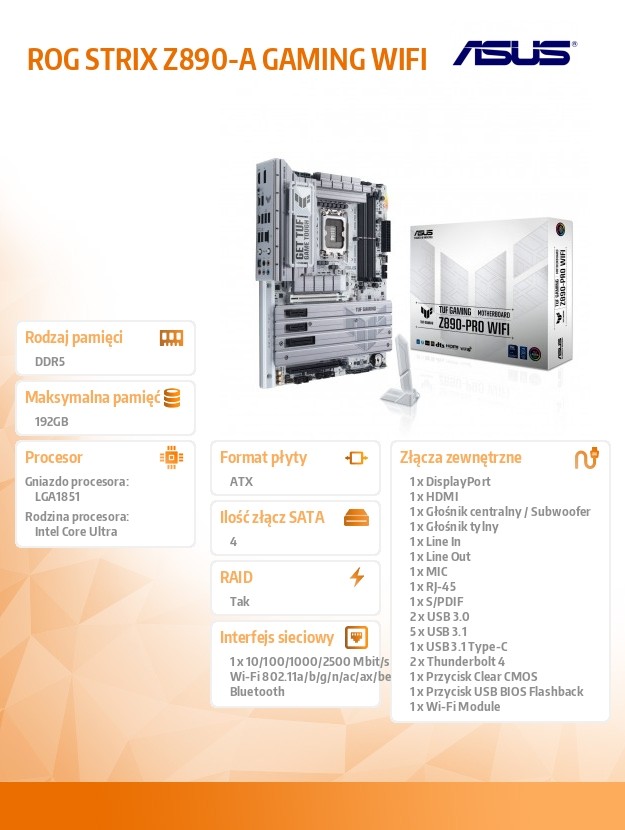 ASUS TUF GAMING Z890-PRO WIFI wykorzystuje wszystkie niezbędne elementy najnowszych procesorów Intel Core Ultra (seria 2) i łączy je z funkcjami gotowymi do gry i sprawdzoną wytrzymałością. Zaprojektowana z komponentów klasy wojskowej, ulepszonym rozwiązaniem zasilania i kompleksowym systemem chłodzenia, ta płyta główna przekracza oczekiwania dzięki solidnej i stabilnej wydajności podczas maratonów grania. Płyty główne TUF GAMING przechodzą również rygorystyczne testy wytrzymałościowe, aby upewnić się, że poradzą sobie w warunkach, w których inne mogą zawieść. Ta platforma zapewnia moc i łączność, których wymagają zaawansowane aplikacje komputerowe AI.
