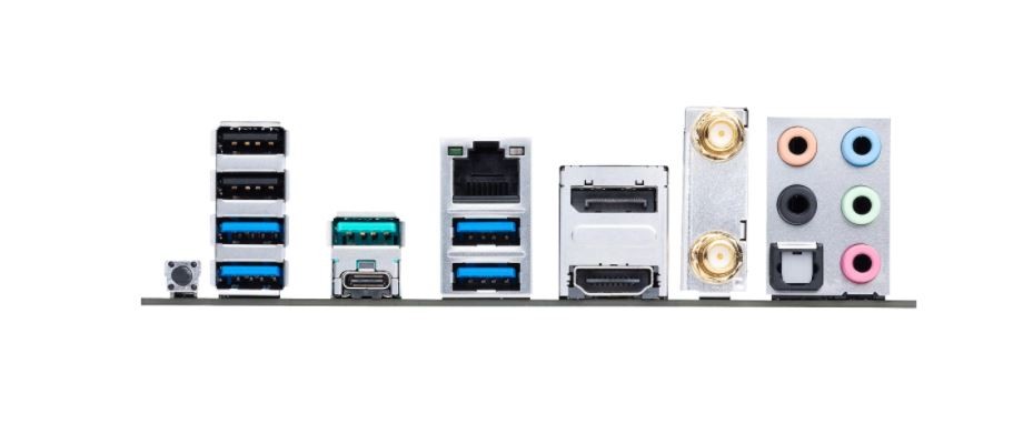 Złącza zewnętrzne: 1 x Głośnik tylny (czarny), 1 x HDMI, 1 x DisplayPort, 1 x USB 3.1 Type-C, 1 x Line In (błękitny), 1 x Line Out (zielony / headphones), 1 x MIC (różowy / microphone), 1 x RJ-45, 1 x S/PDIF, 2 x USB 2.0, 4 x USB 3.0, 1 x USB 3.1, 1 x Głośnik centralny / Subwoofer (pomarańczowy), 1 x Przycisk BIOS Flash, 2 x SMA