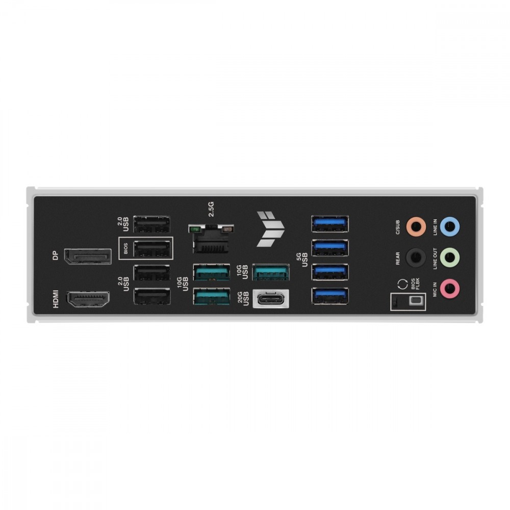 Złącza zewnętrzne: 1 x Głośnik tylny (czarny), 1 x USB 3.2 Gen 2x2 Type-C, 1 x Przycisk BIOS Flash, 3 x USB 3.2 Gen 2 Type-A, 1 x Line Out (zielony / headphones), 1 x MIC (różowy / microphone), 1 x RJ-45, 4 x USB 2.0, 4 x USB 3.2 Gen 1 Type-A, 1 x Głośnik centralny / Subwoofer (pomarańczowy), 1 x HDMI, 1 x DisplayPort